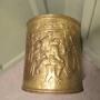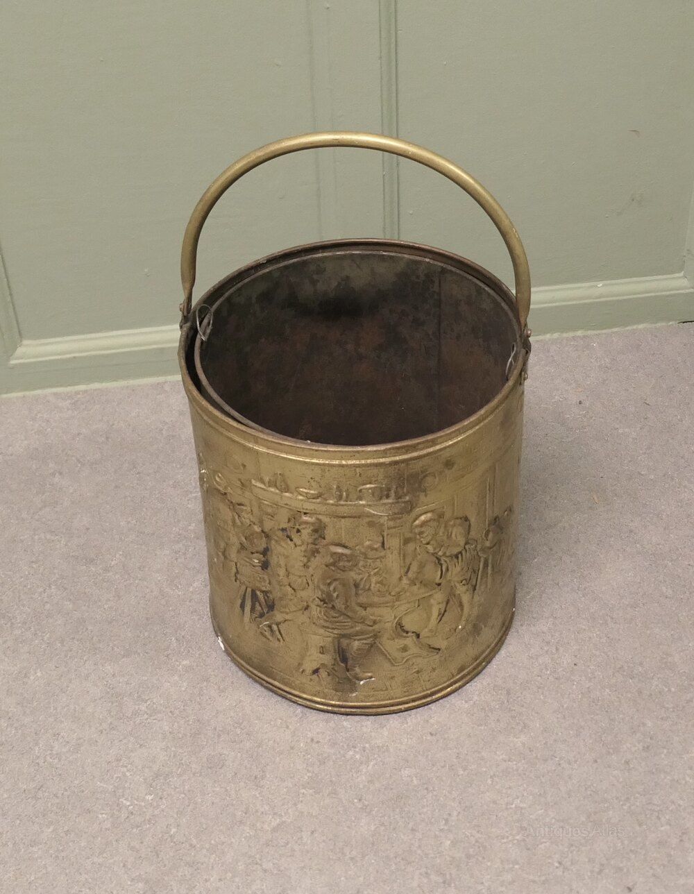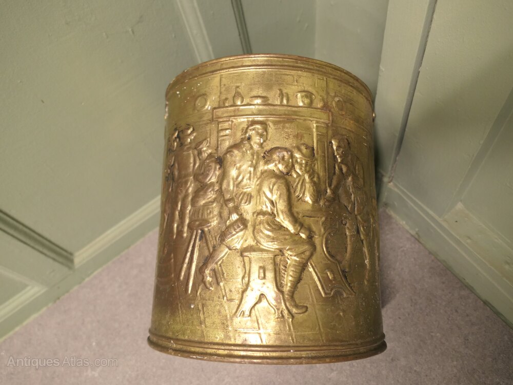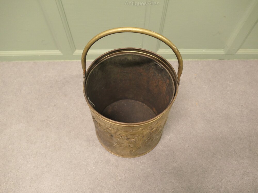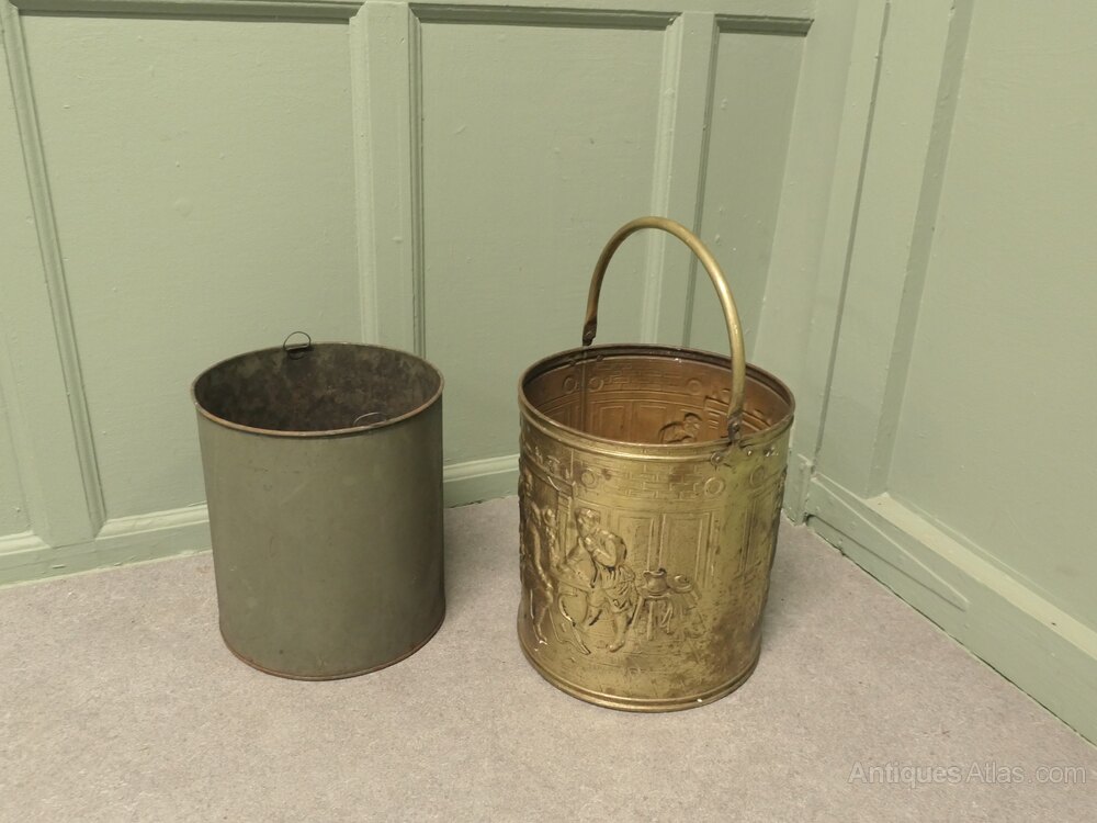 Arts and Crafts Brass Coal Bucket with Tavern ScenesThis is a lovely old bucket it is made in beaten brass and has embossed Tavern and Country scenes around the outside, the bucket has a strong handle and a removable liner