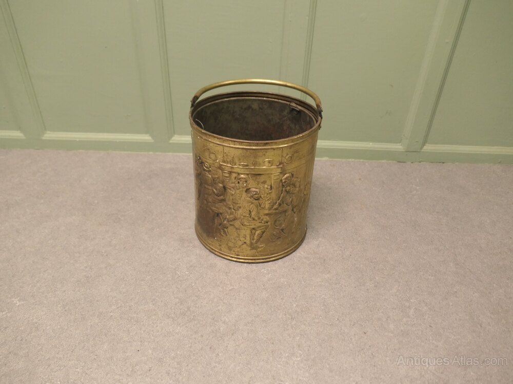 Arts and Crafts Brass Coal Bucket with Tavern Scen