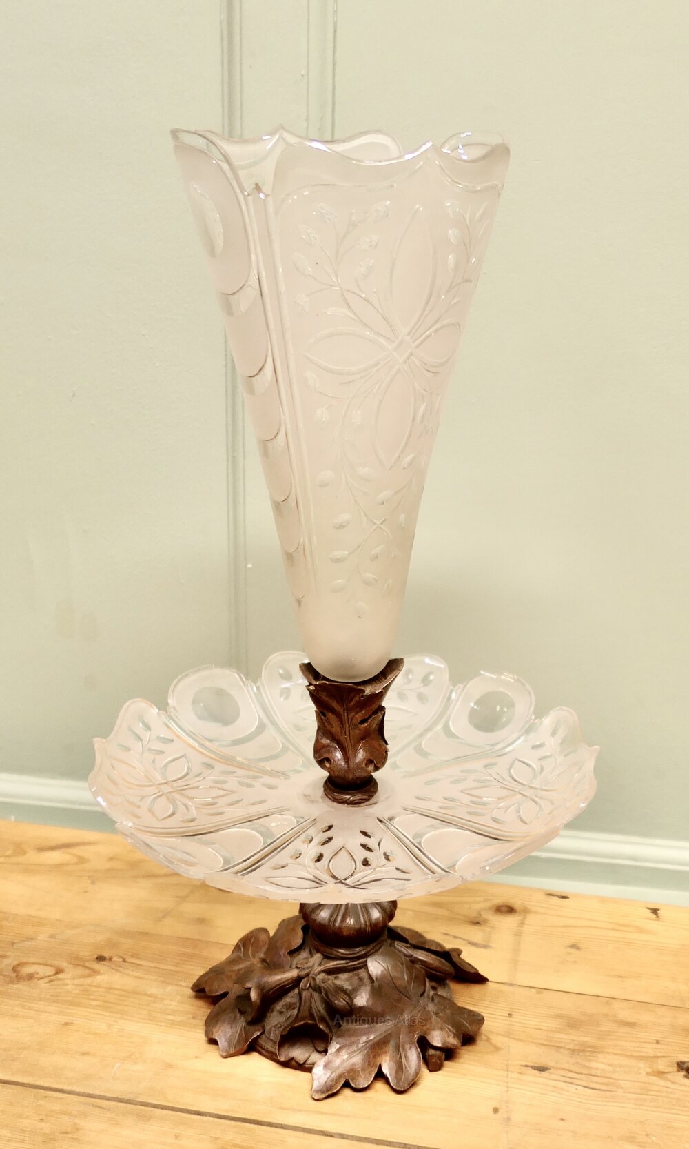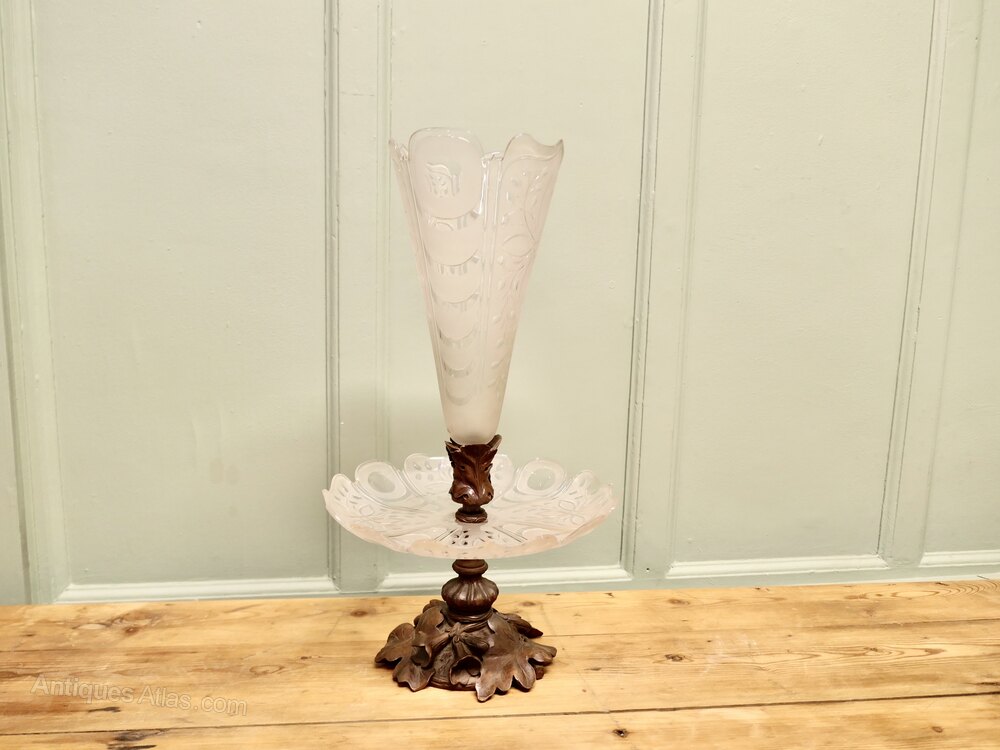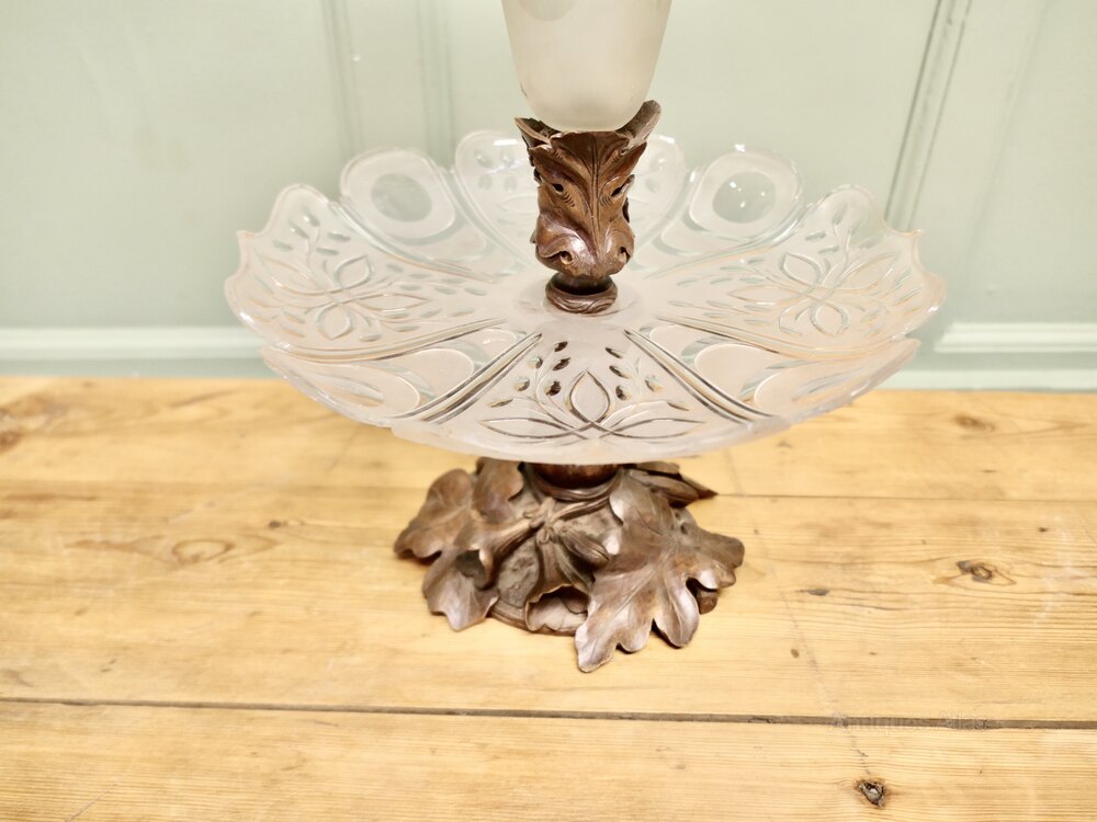 Carved Black Forest and Baccarat Crystal Epergne Centre PieceA superb and very unusual combination, a Back Forest pedestal carved with oak leaves, mounted with an etched crystal dish, which in turn has another Black Forest carved mount holding a matching Vase