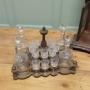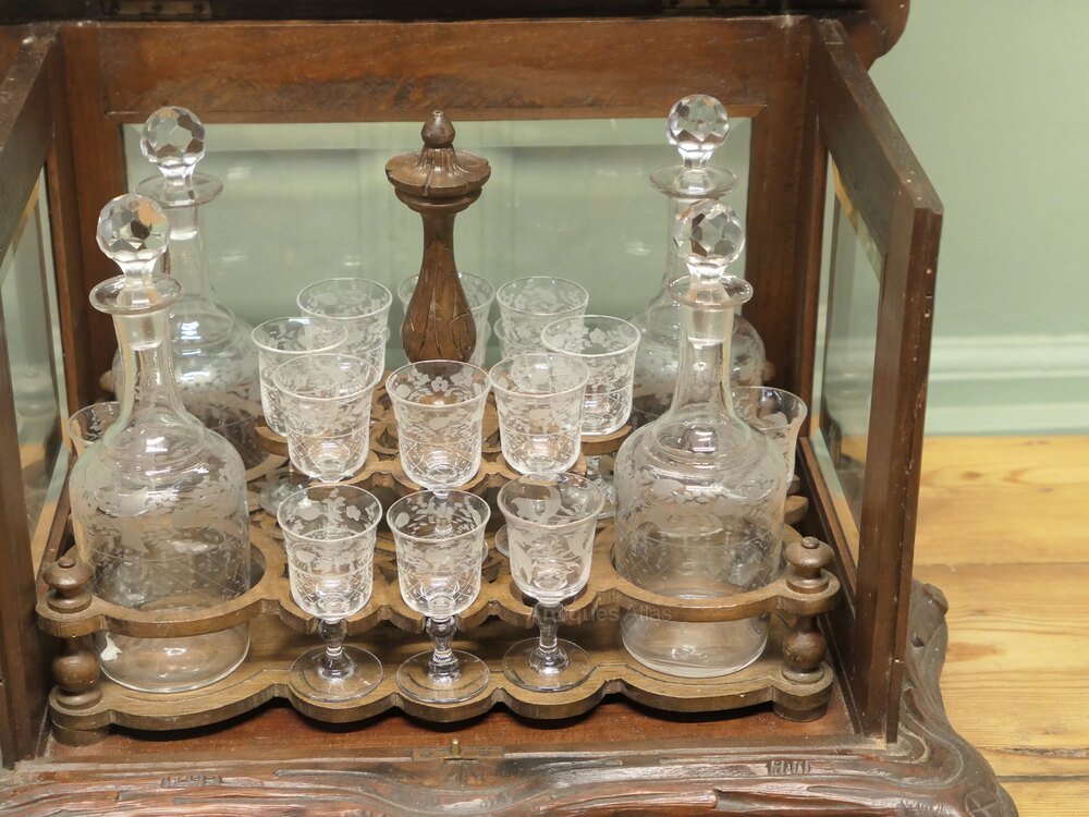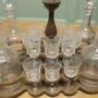 Inside we have 4 decanters and 16 liqueur glasses, these are quite charming, they are daintily etched, there are slightly different patterns on 6 of the glasses