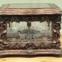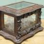 The cabinet has bevelled Glass panels to the front back and sides with charming Carved Leaves in the Black Forest style, the lid lifts upward and then falls back allowing the front to be open for ease of access.