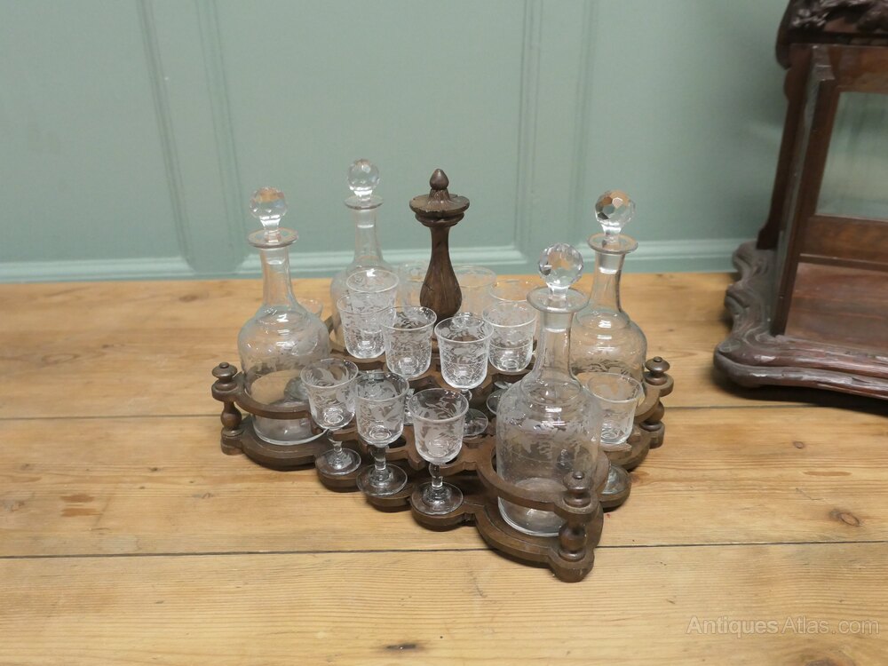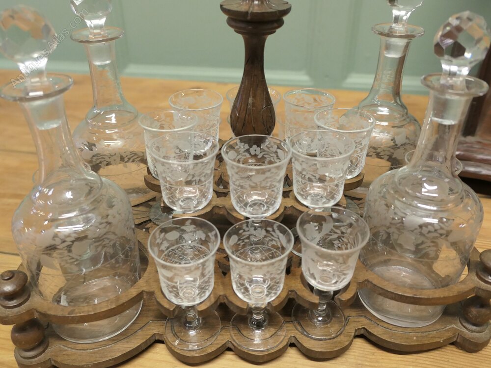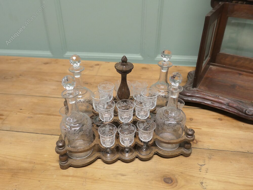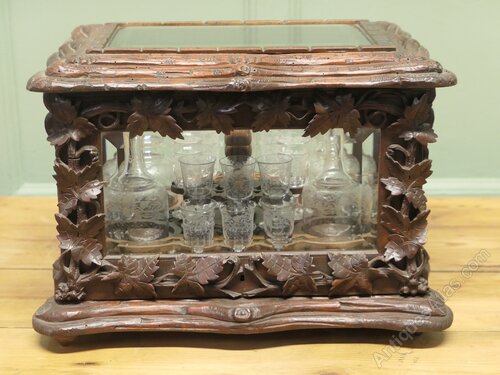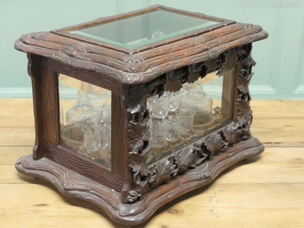 Black Forest “Cave de Liqueur”This is a wonderful piece of Craftsmanship it is a Carved Tantalus or Cave de Liqueur with 4 Decanters and 16 Shot Glasses