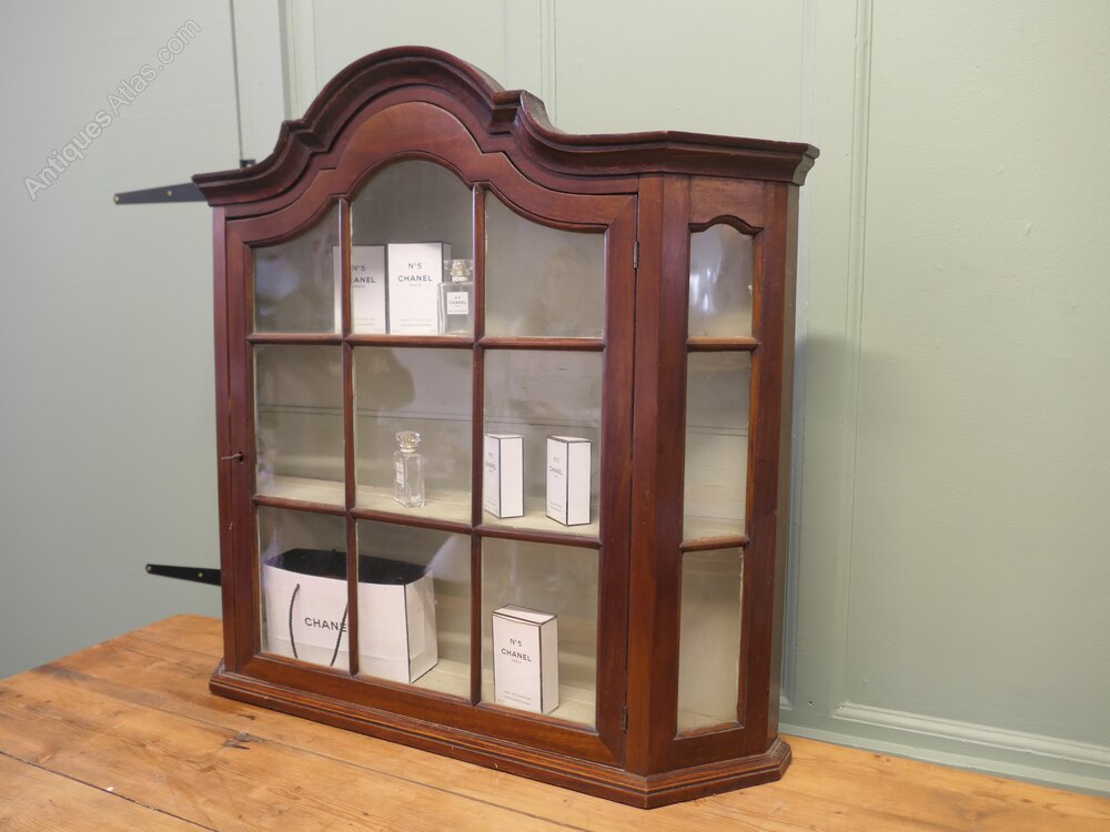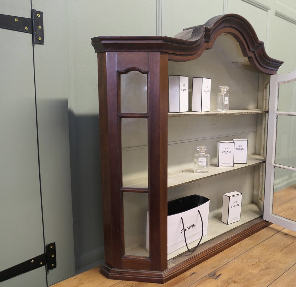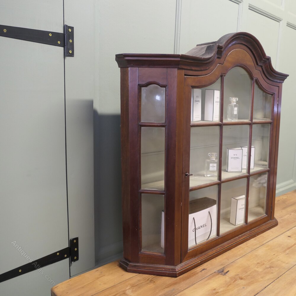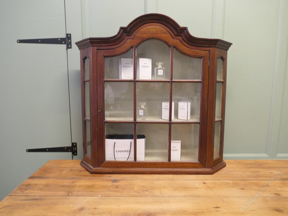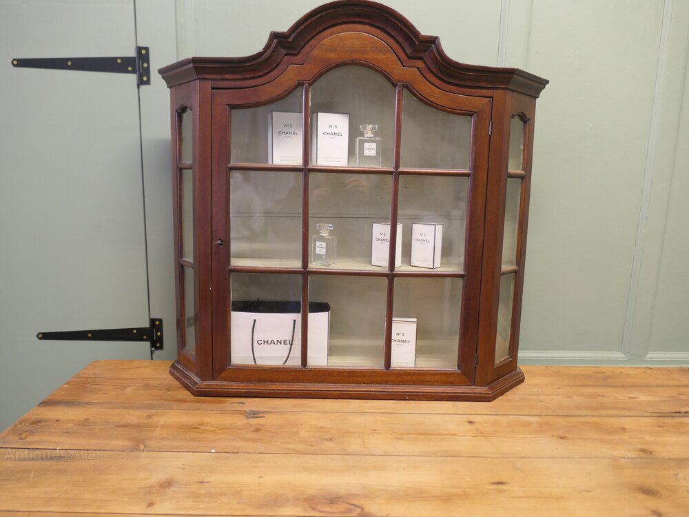Victorian Wall Hanging Arch Top Astral Glazed Display CabinetThis is a very attractive Mahogany Wall hanging cabinet, it has an attractive cornice to the arch top, the interior is in cream and has shelves each with a small plate groove