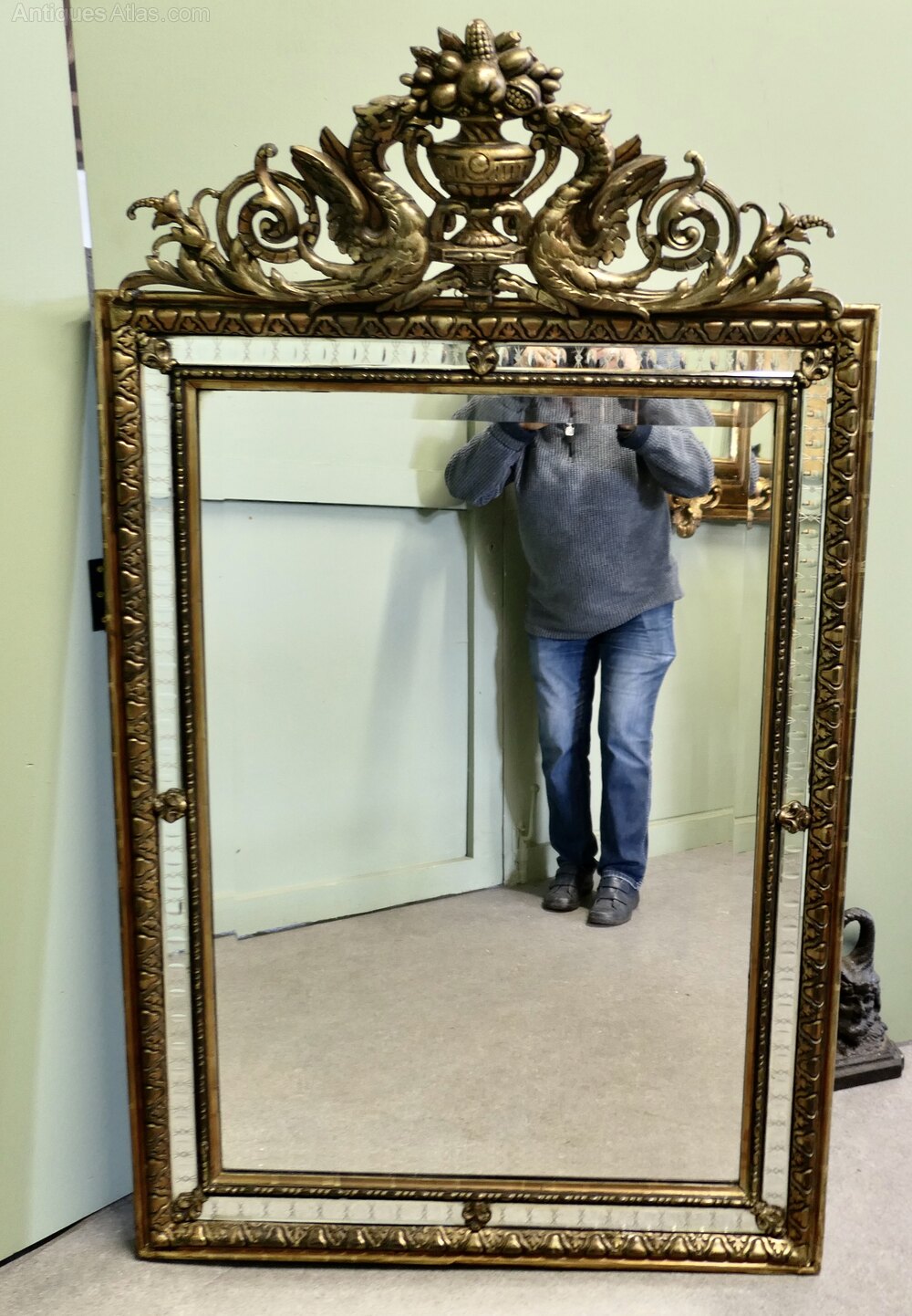 French Black and Gilt Wall Mirror, Dragons and CrestThis is a striking piece, the mirror frame is in black and gold with a mirror mosaic, in the centre at the top of the mirror there is a 12” high crest with a fire breathing dragon on either side.
