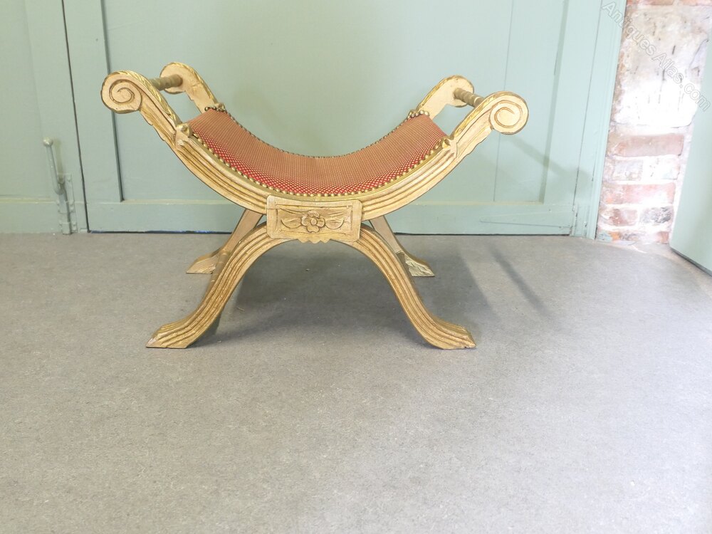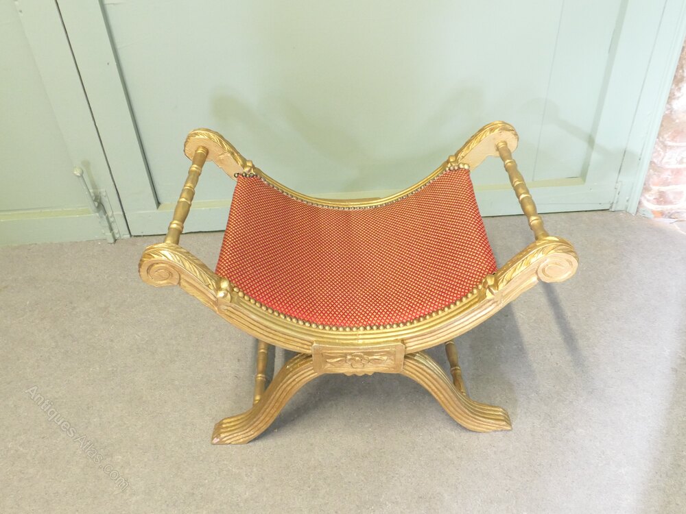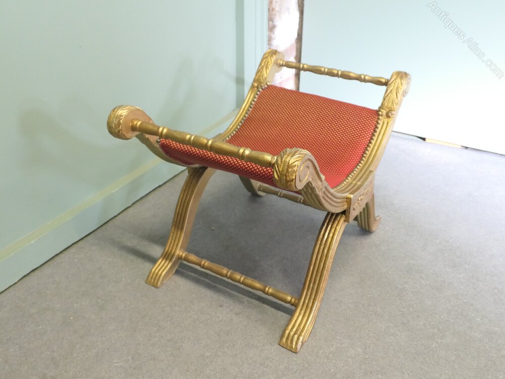 19th Century Empire Style Gilt X Frame StoolA superb antique Neo-Classical X Frame stool in the Empire style, the stool has relatively new upholstery and the show wood is carved and gilded in the classical style