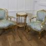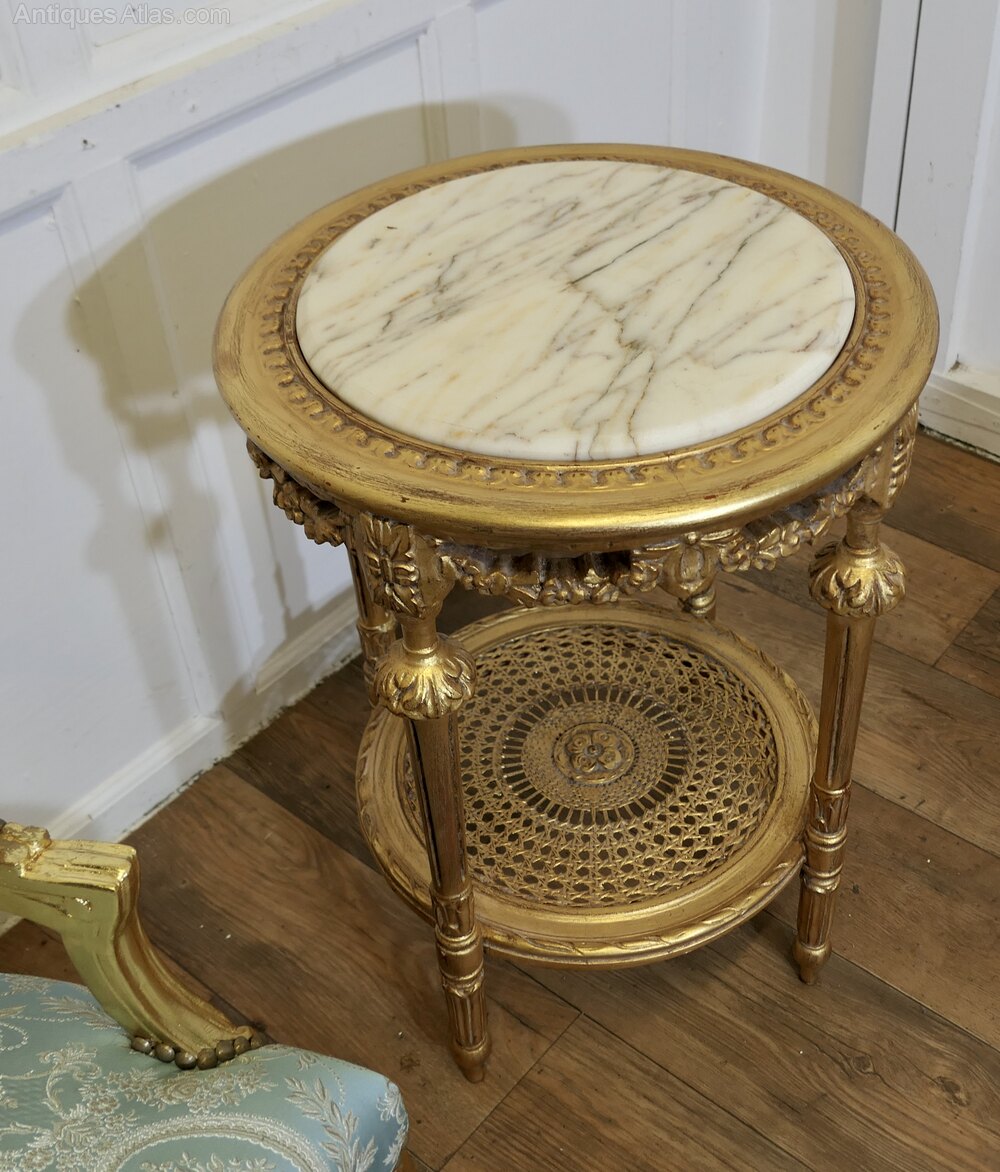 A beautiful pair newly brought from France, we have included with them a matching round gilt table which has a marble top and and a bergère under-tier