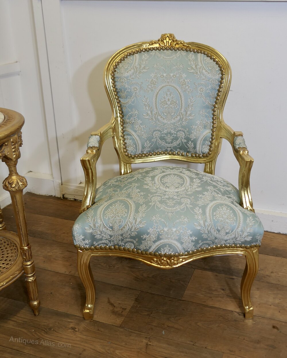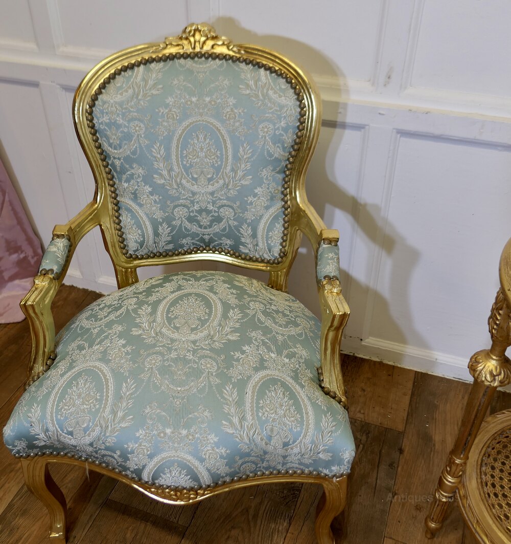 A Superb Pair of French 19th Century Gilt Salon ChairsThese Elegant Chairs have been re finished and upholstered in pale blue Silk Damask, they have a serpentine shaped front and carved detail to the show wood