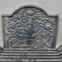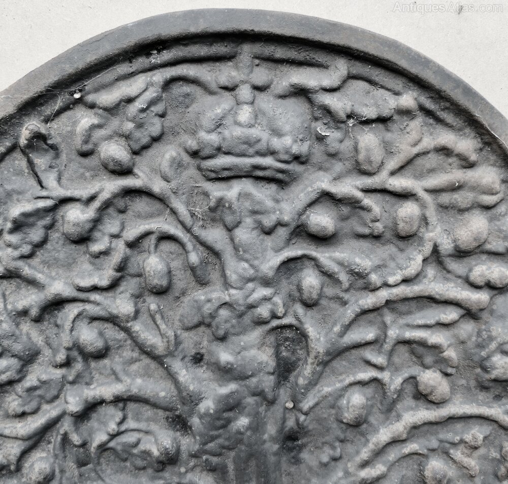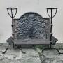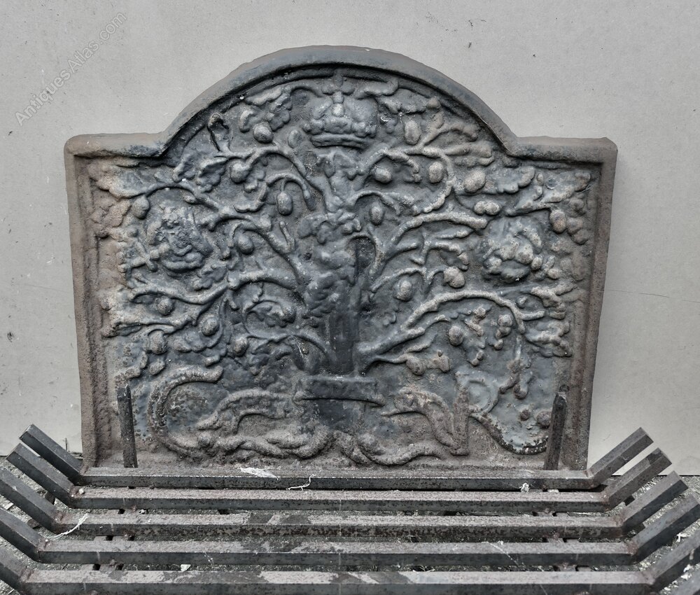 Very Heavy Large Fire Back with Andirons and Large GrateThe fire back tells the story of King Charles II who was reputed to have hidden in the Oak tree to avoid capture, you can see the crowns and his initials quite clearly