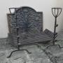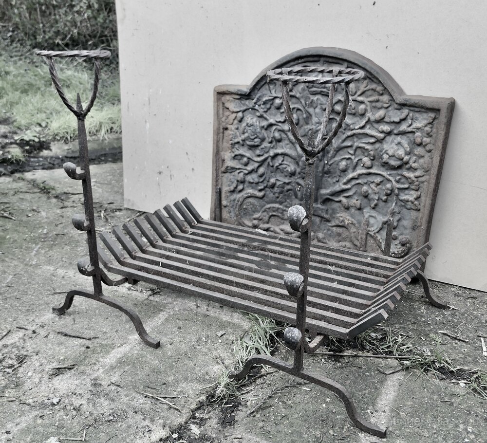 The Fire Back which is 3” thick comes with some tall soup bowl andirons and a replacement grate so very useable in a large fireplace