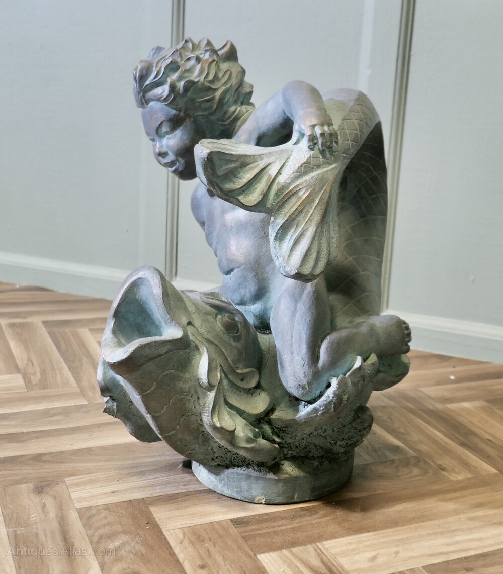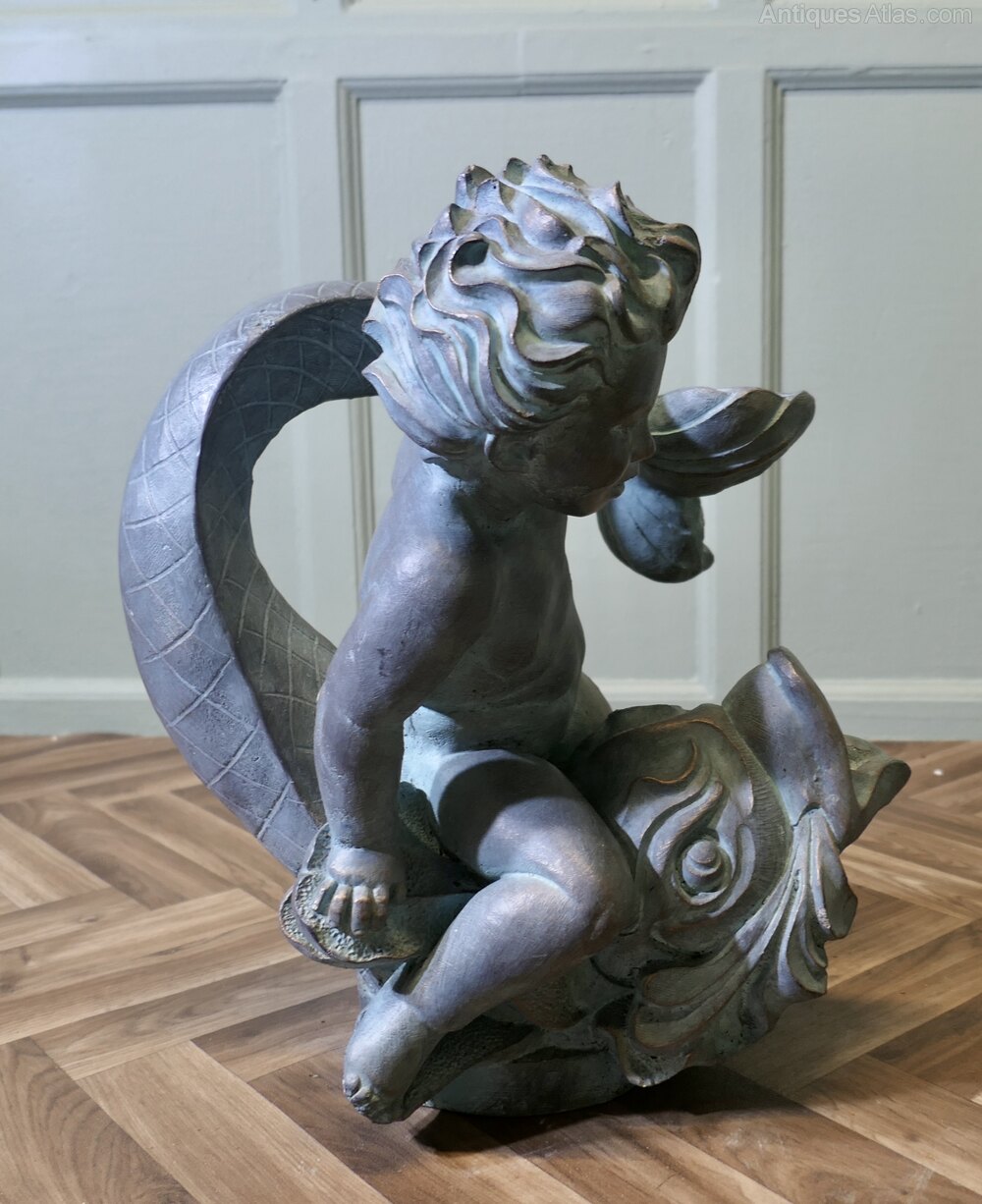 Sculpture of a Cherub Riding a Fish, Fountain Water FeatureA superb verdigris patinated Sculpture this one is designed as a fountain