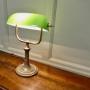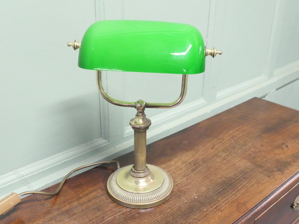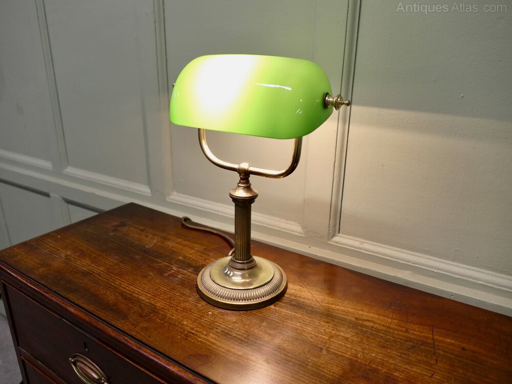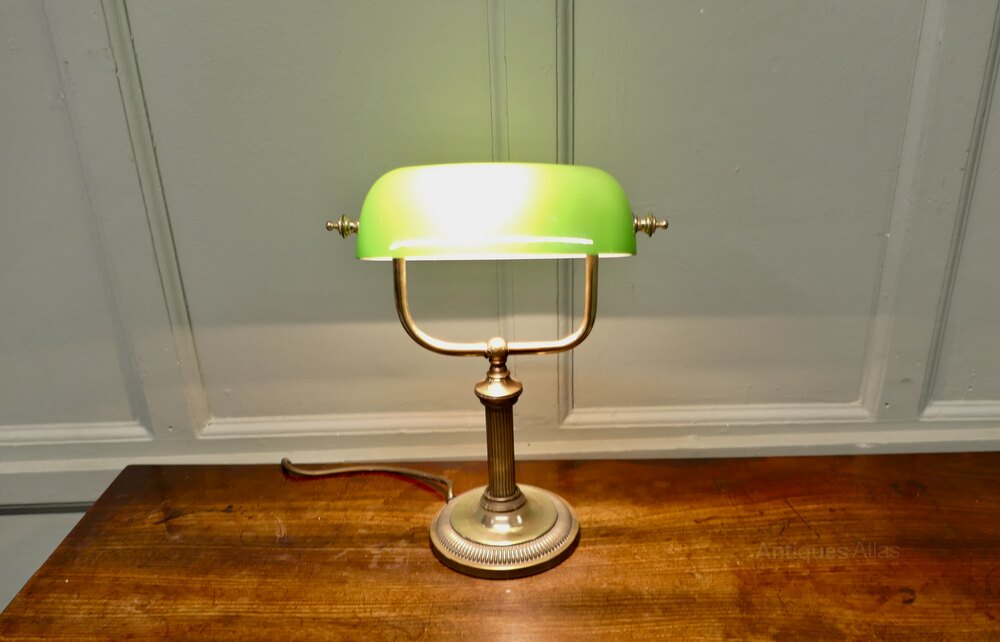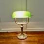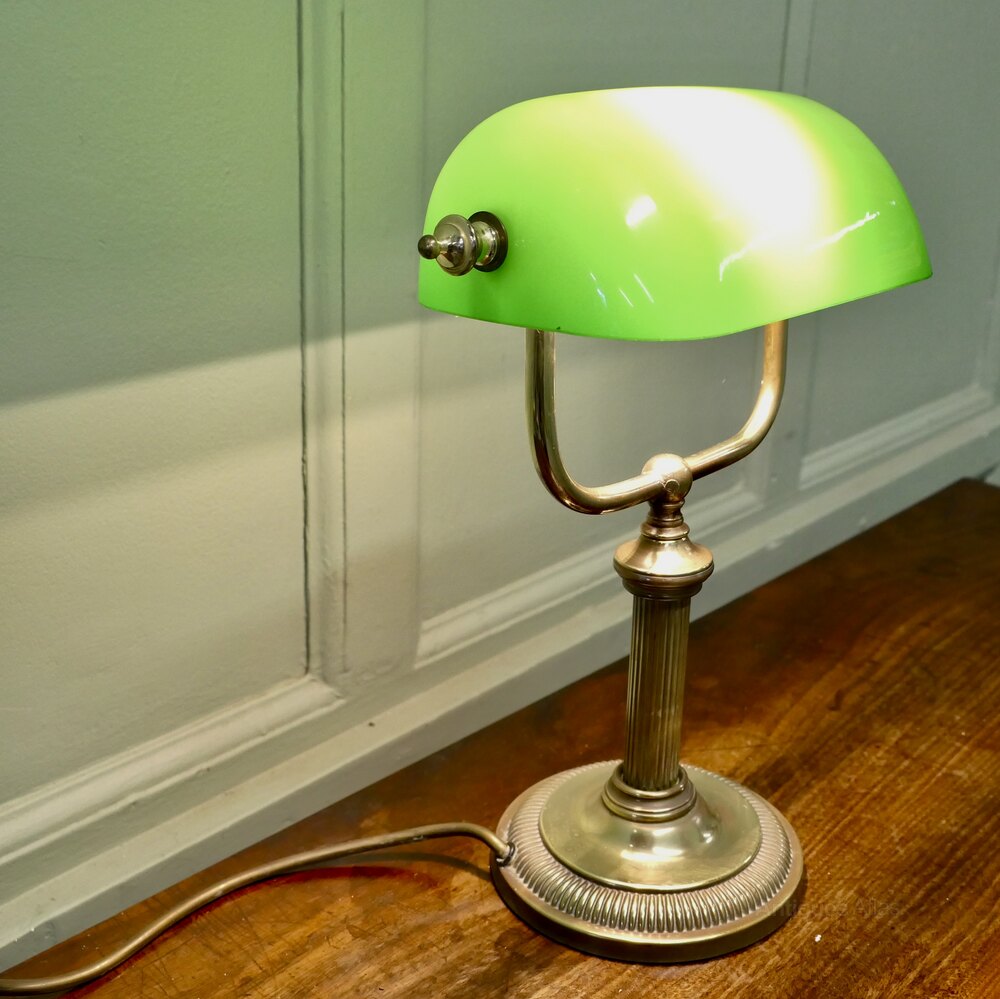 Brass and Green Glass Library Desk LampA beautiful vintage barrister’s style brass desk lamp, with its original green glass lampshade which has a white reflective underside