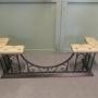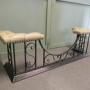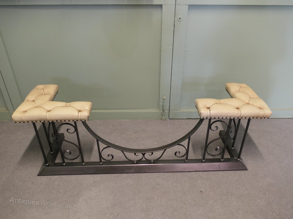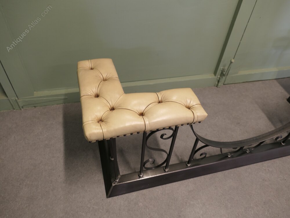 Polished Steel Wrought Iron and Leather Club FenderThis is an elegant piece of country House Furniture with soft cream deeply buttoned upholstery and wrought iron detail