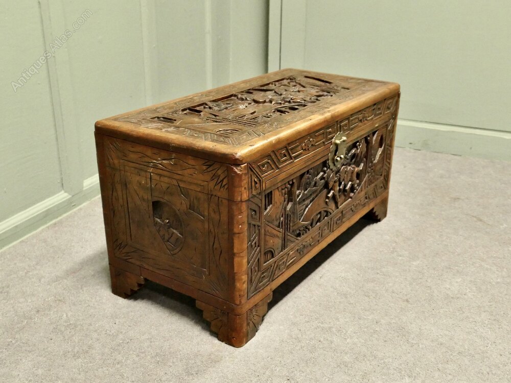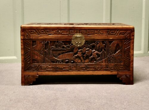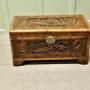 Petite Carved Camphor Wood ChestThis Beautiful Little Carved Chest is made from Camphor Wood, for those of you who do not know camphor wood it looks a little like Mahogany it is a hard wood which lends itself very well to carving.