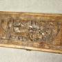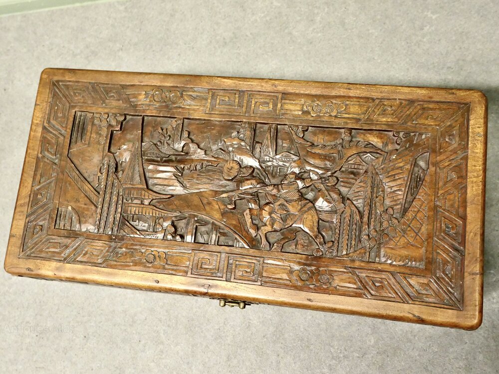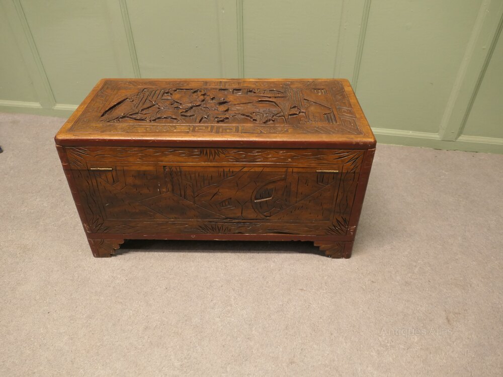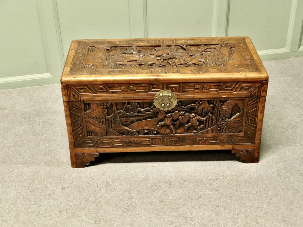The carvings are mainly of Oriental Warriors on horse back, the chest is carved on every side, it stands on small bracket feet and it is clean insideThe Chest is in good condition, it is 29” long x 16” high and 14” deep
