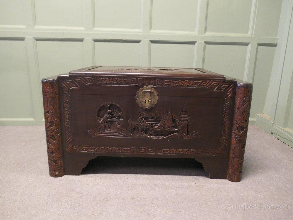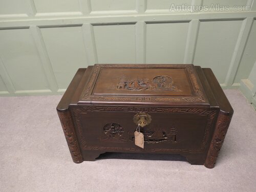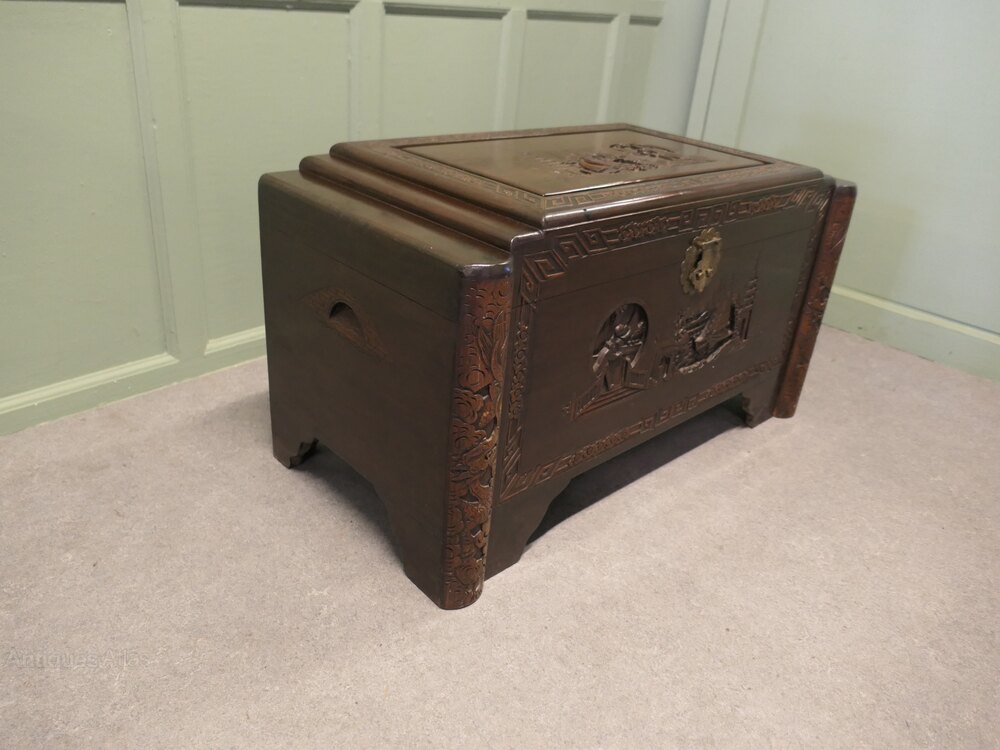 Art Deco Oriental Carved Dark Camphor Wood ChestThis Beautiful Carved Chest is made from Camphor Wood, for those of you who do not know camphor wood it is a hard wood which lends itself very well to carving.