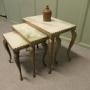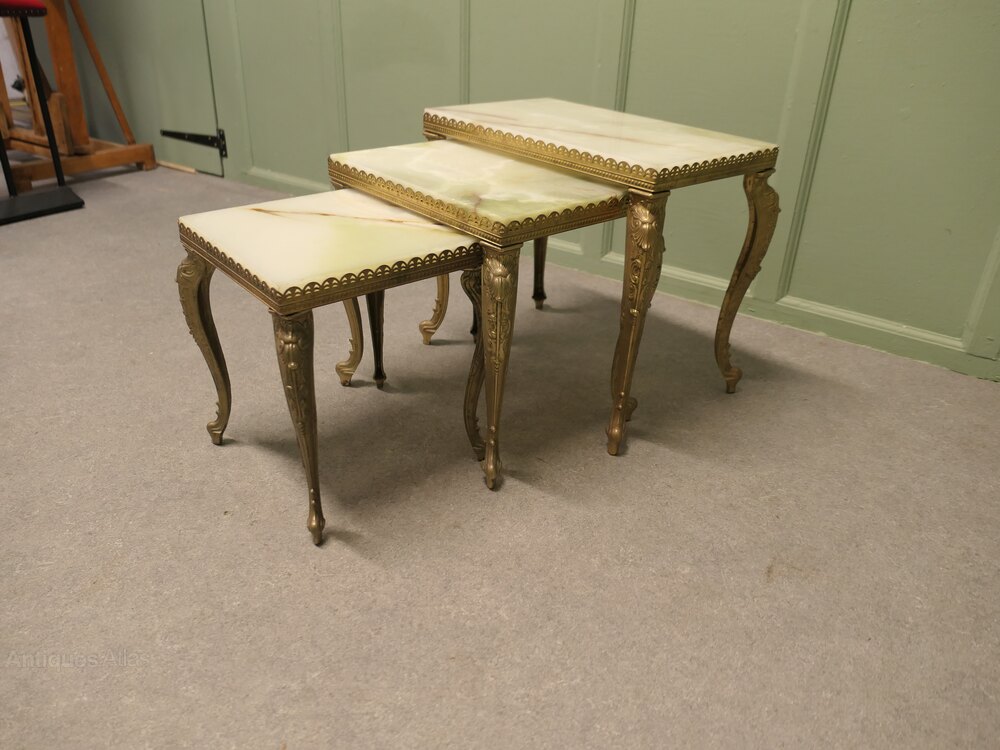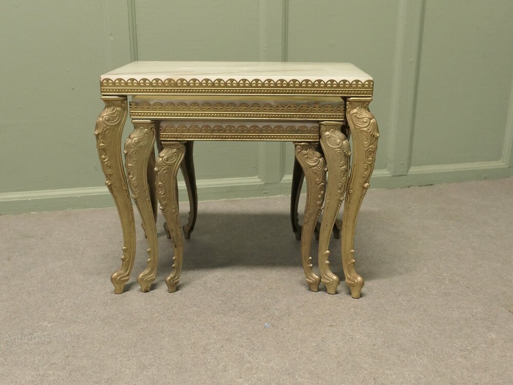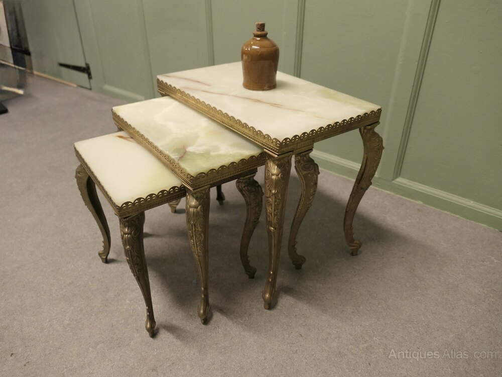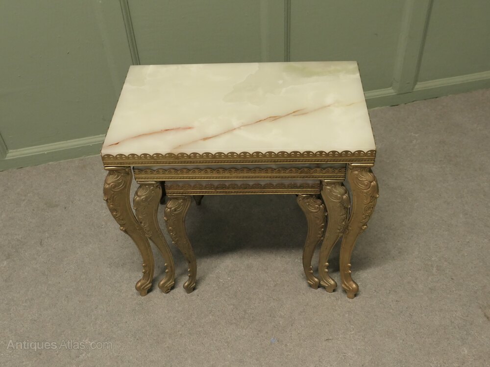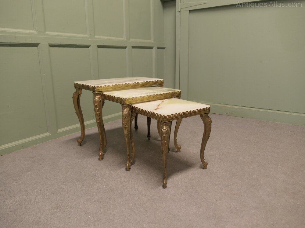 Nest of 3 Brass and Marble Topped TablesThis is a very attractive set, the tables a have decorative brass frame with cabriole legs and the brass surrounds the white Onyx marble tops