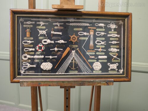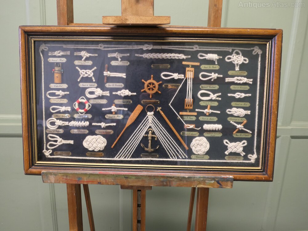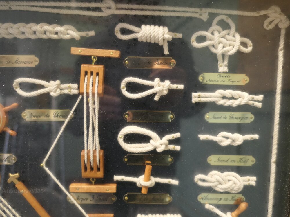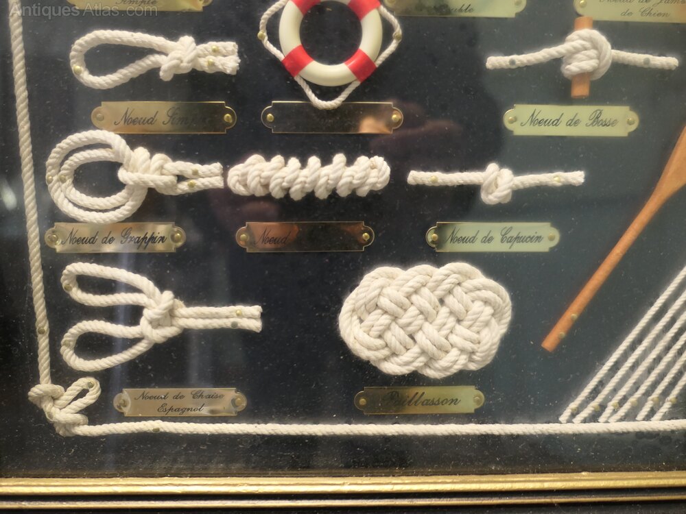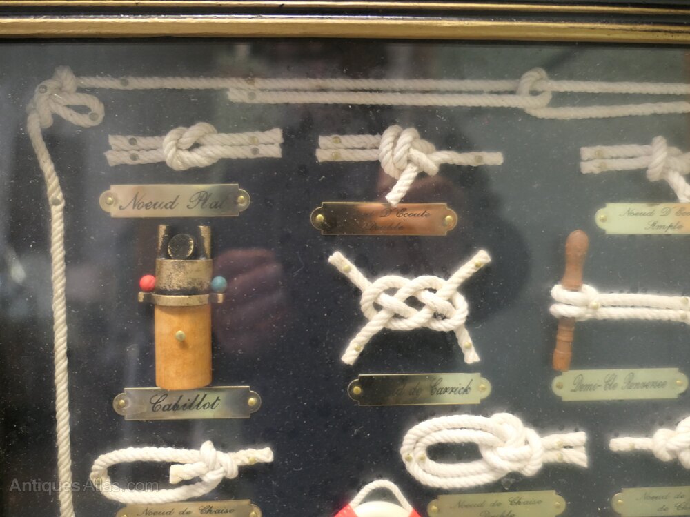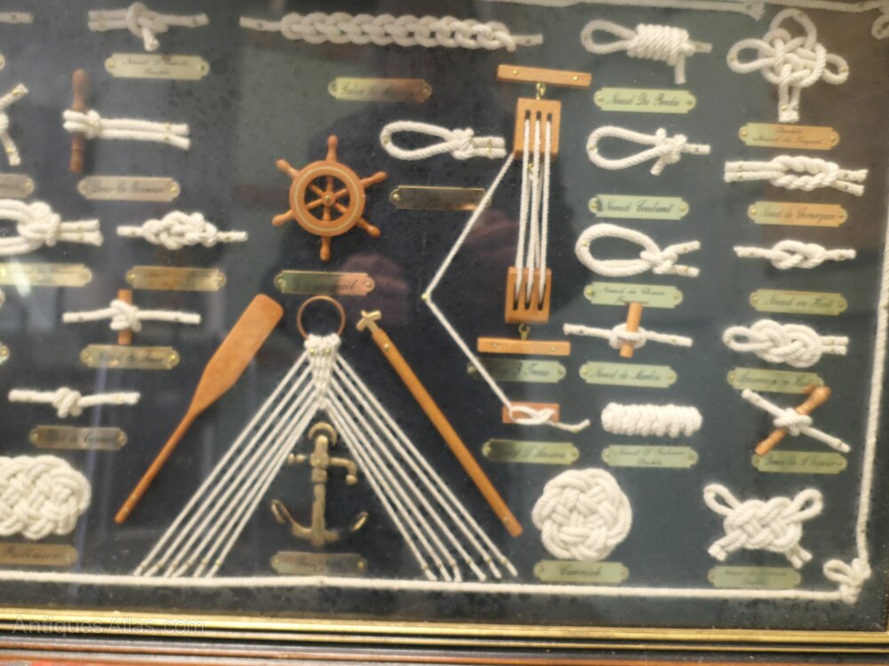 Nautical Objects Shadow BoxThis is an interesting French shadow box with various nautical displays of knots and miniatures all with French name labels
