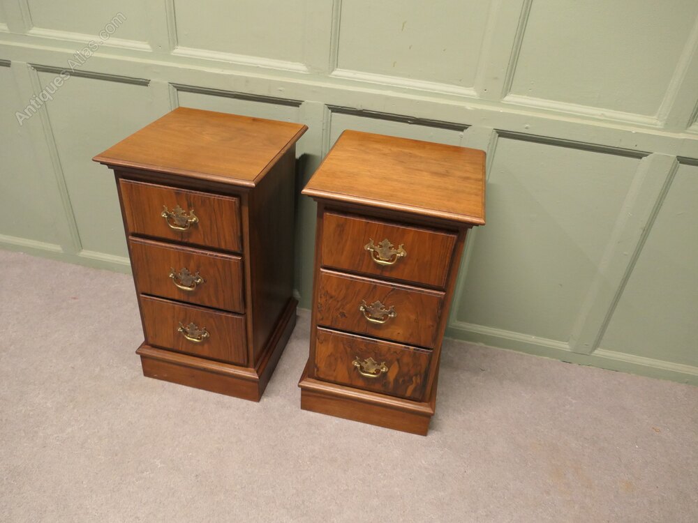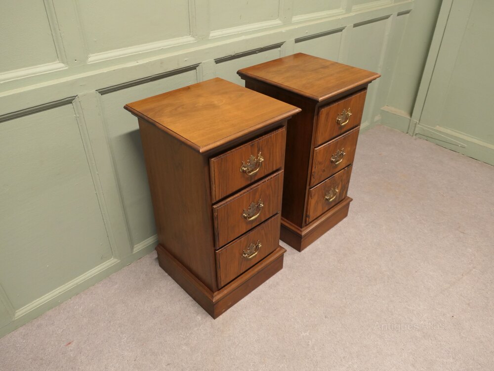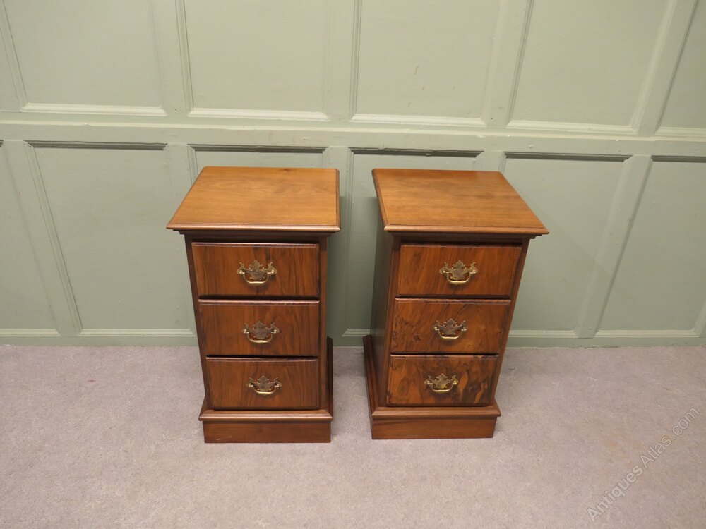 A Pair of Art Deco Walnut Bedside Chest of DrawersThese elegant chests are made with figured walnut they each have 3 drawers