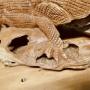 The Iguana has scales and caws, he is lying fully camouflaged on a log