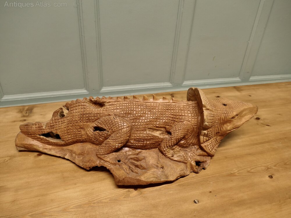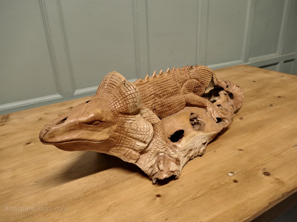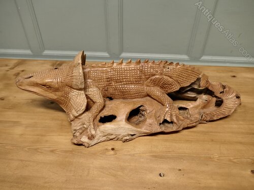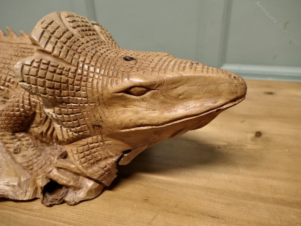 A Hand Carved Live Wood IguanaThis wonderful piece is Carved from a single piece of wood the carving is fully 3 dimensional, when viewed from the underside the hollow grain of the raw wood can be easily seen