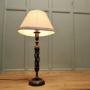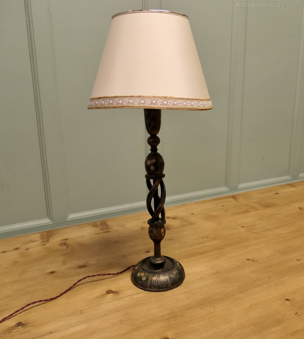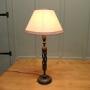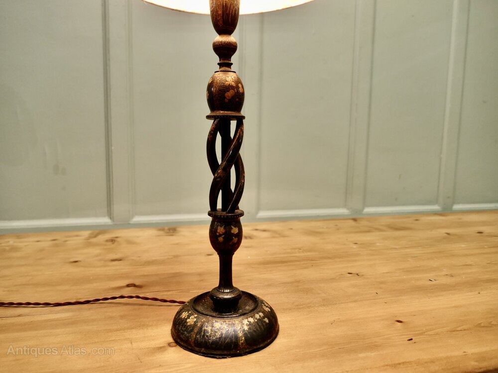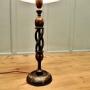 Lovely Turned and Painted Hollow Barley Twist Table LampA skilfully turned piece, this lamp stands on a turned wooden base, the upright column is hollow at one point showing the skill of the carver, the lamp is beautifully hand painted in the Islamic style, mostly in black and gold it is in good condition, the wiring is good, it comes with a used lamp shade