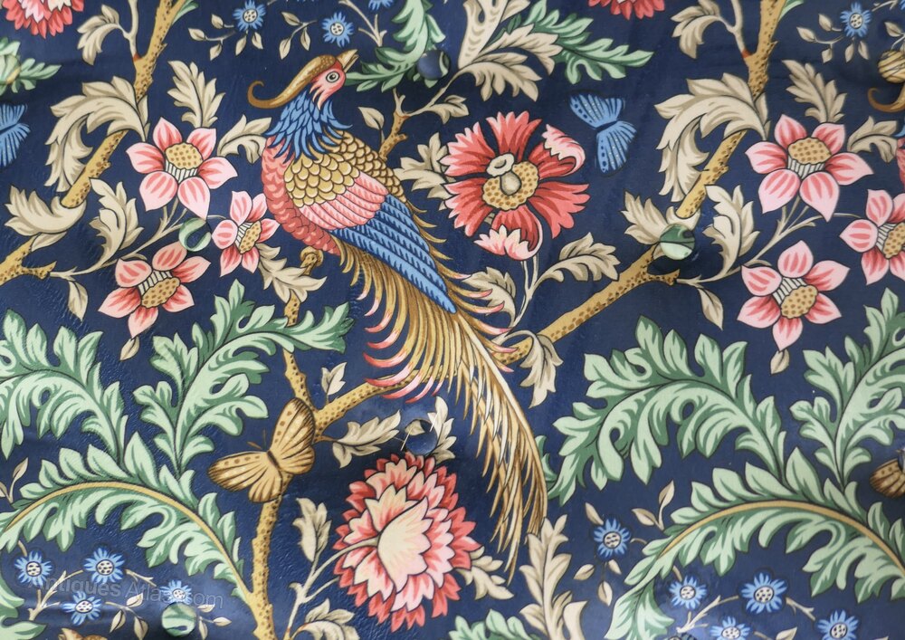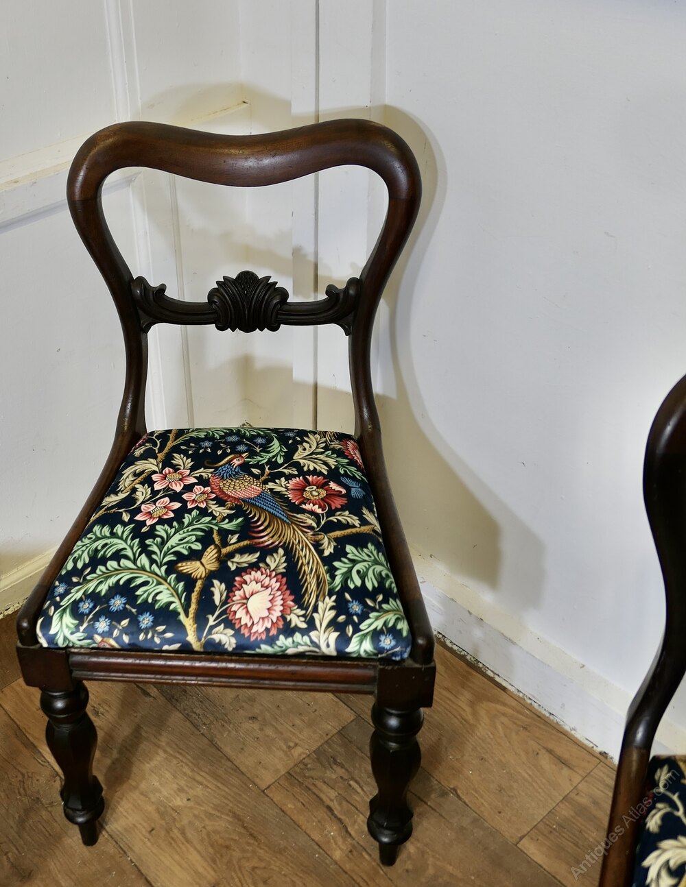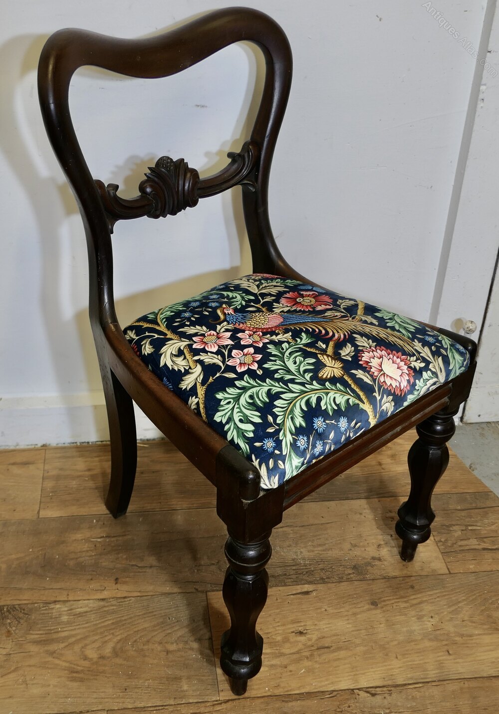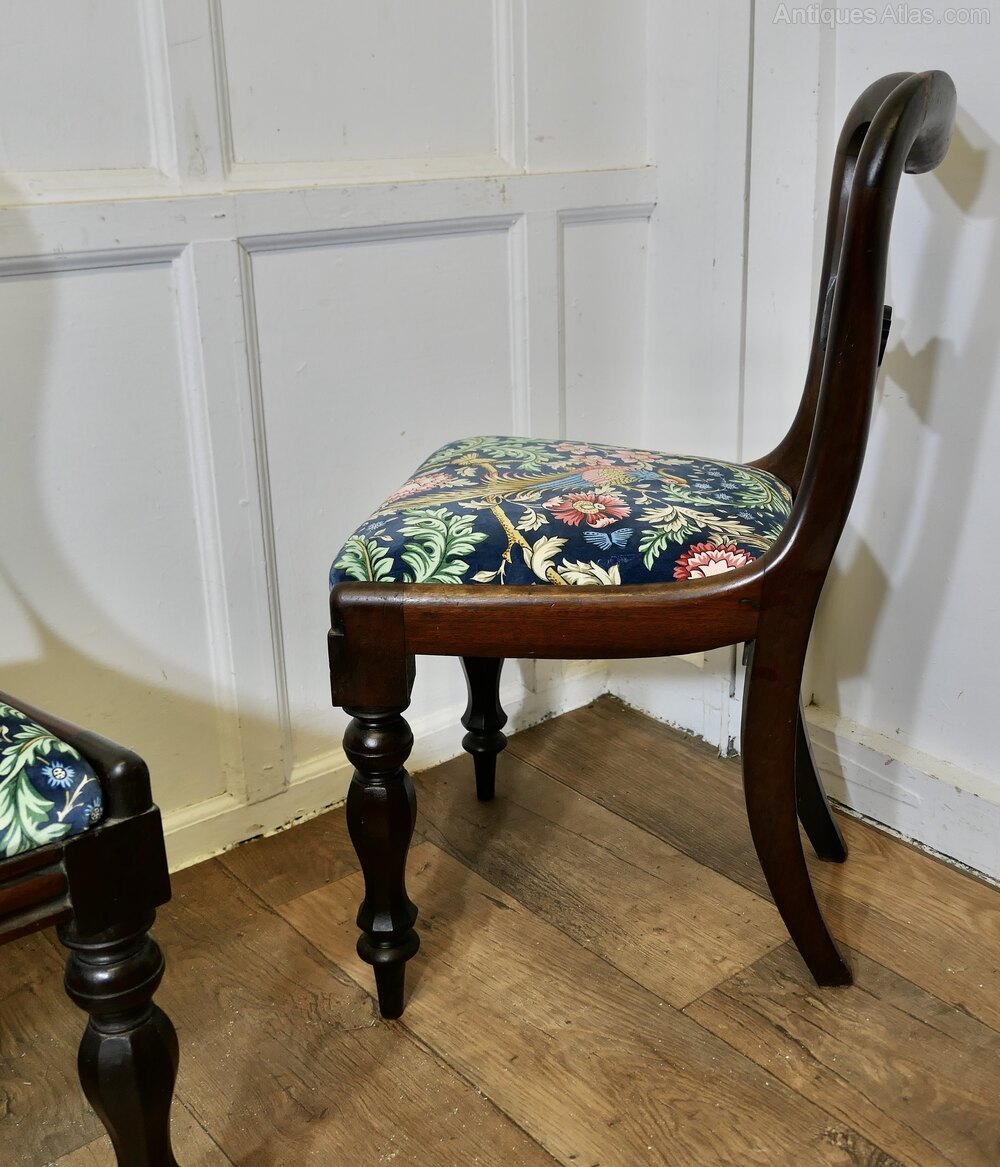 Set of 6 Victorian Dining Chairs, Upholstered with William Morris VelvetA superb quality set of chairs, the chairs have a shaped balloon back top rail, turned legs and they have new upholstery, the chairs have been covered with Liberty Blue Oakmere Velvet, a superb soft fabric with birds, flowers and leaves