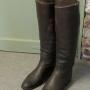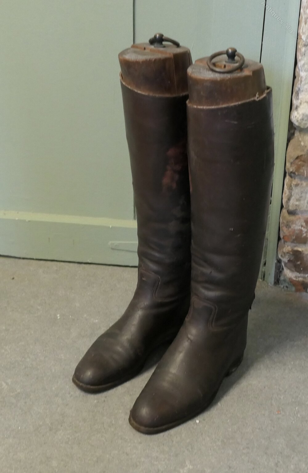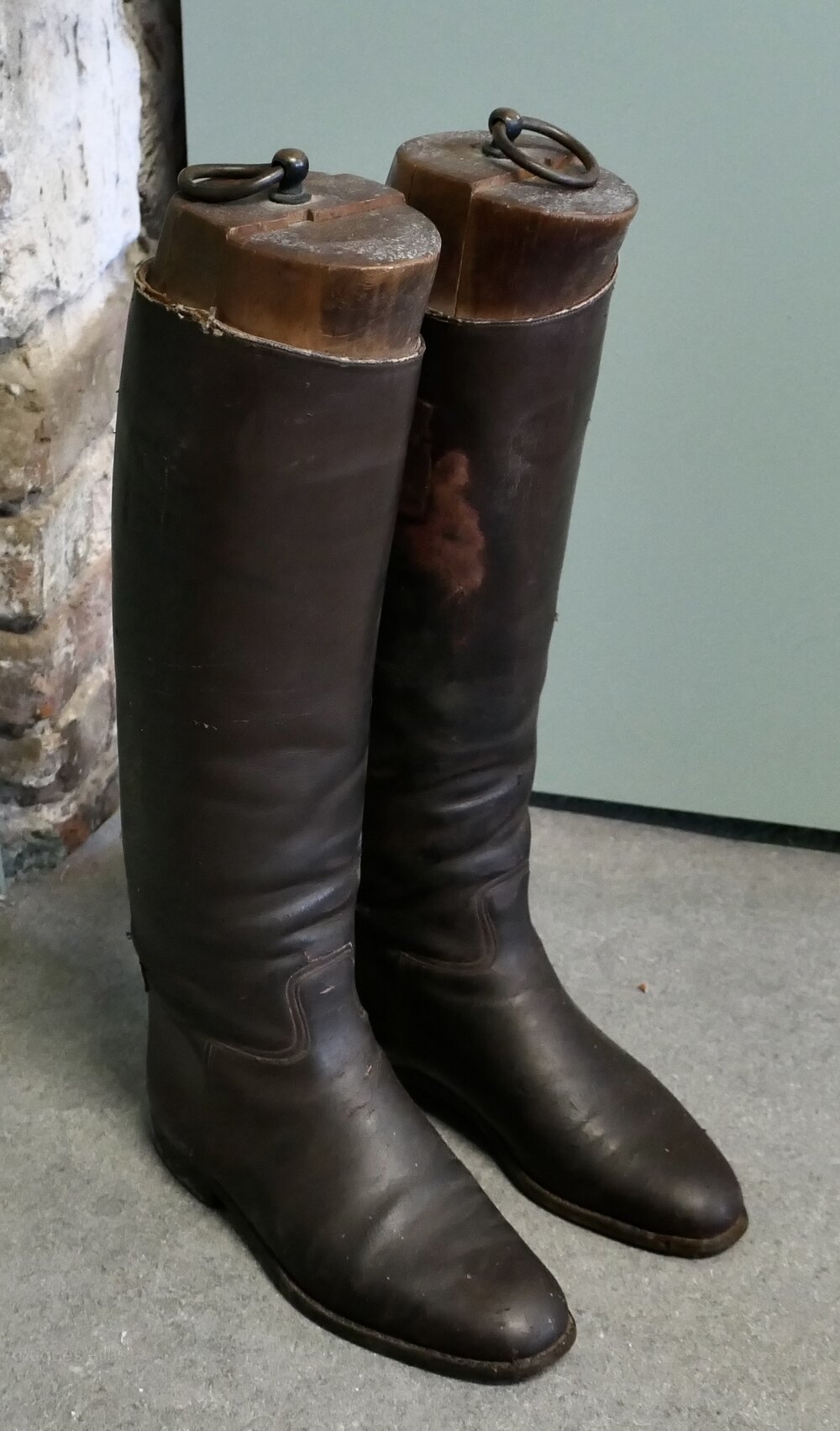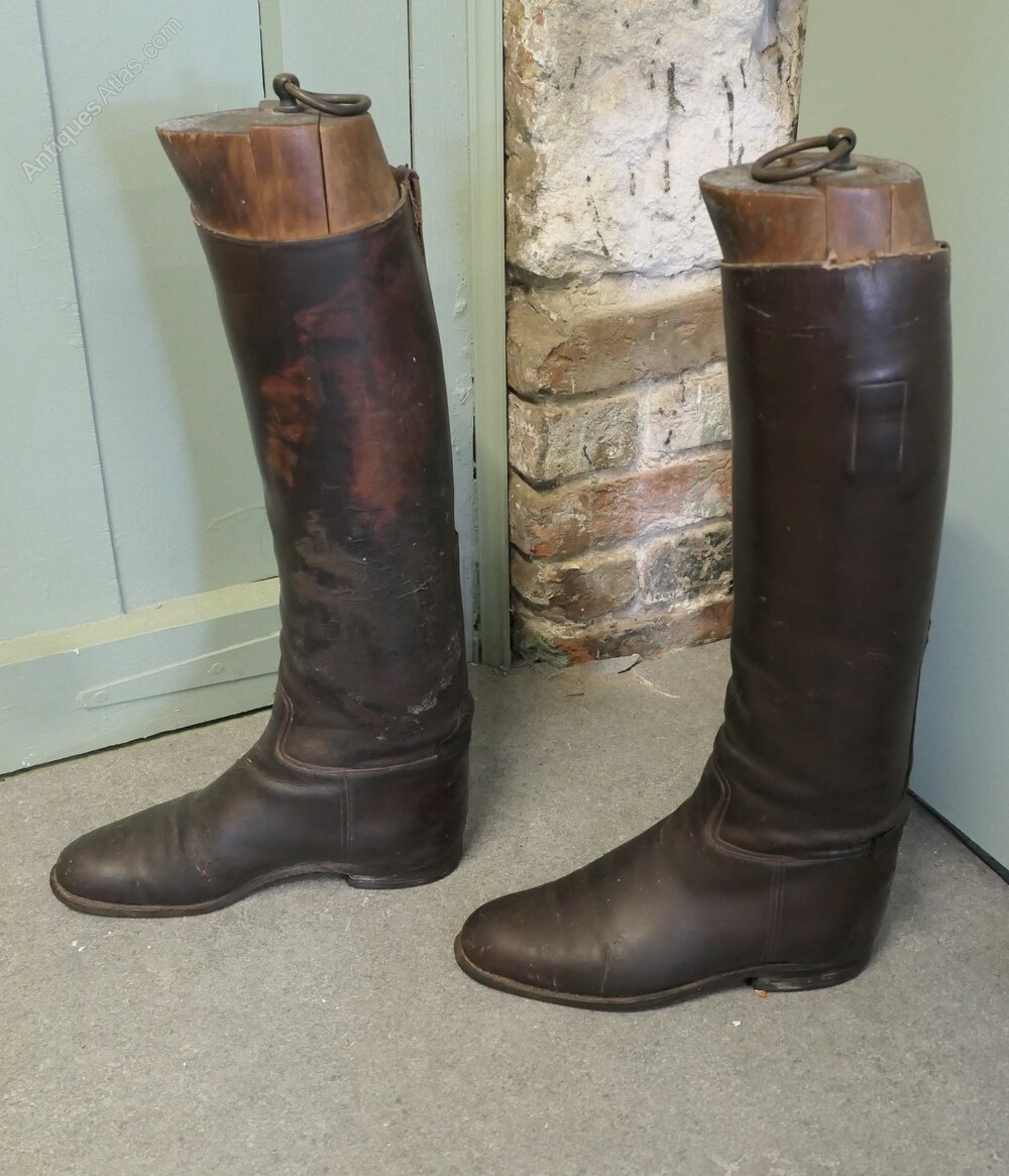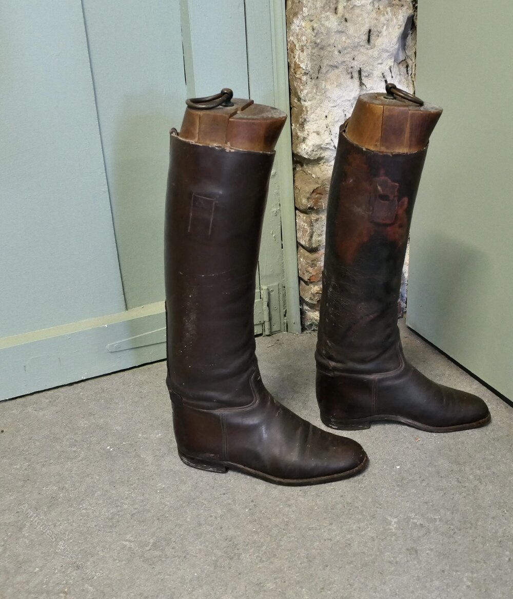 Pair of French Gentleman’s Antique Leather Riding Boots With Wooden TreesThese are good quality boots in Dark Brown Leather, they have been well used and look the part for any shop window or interior display.