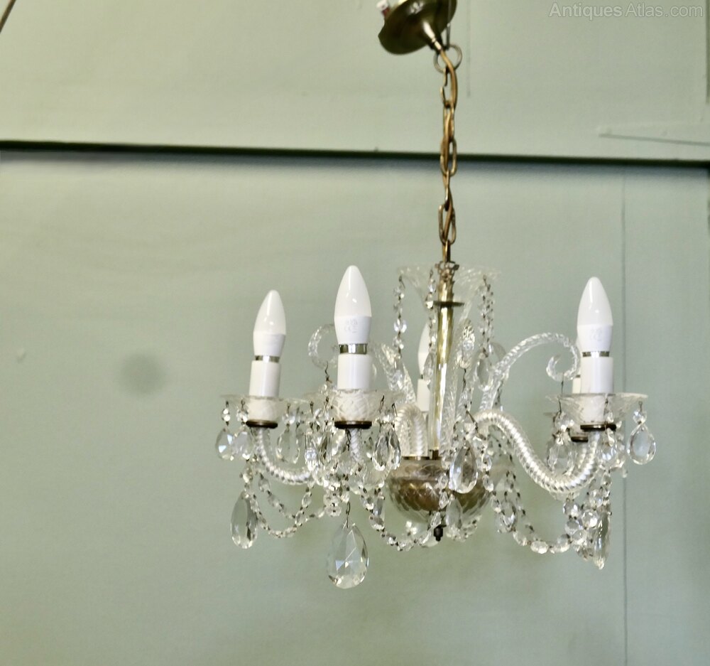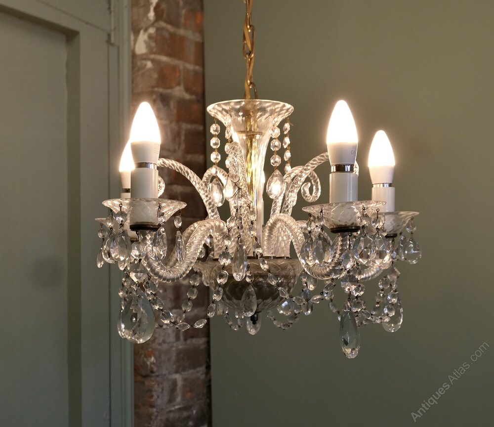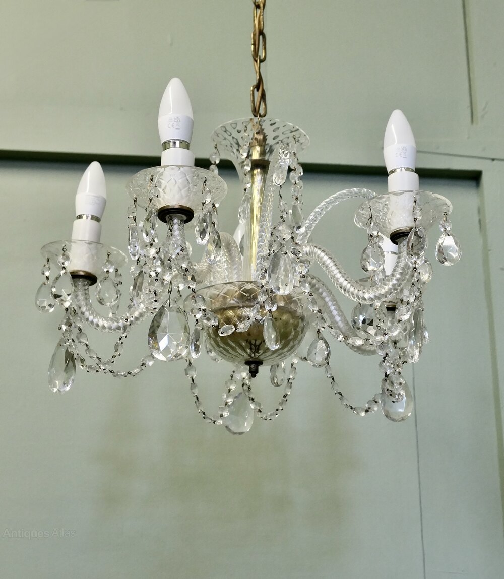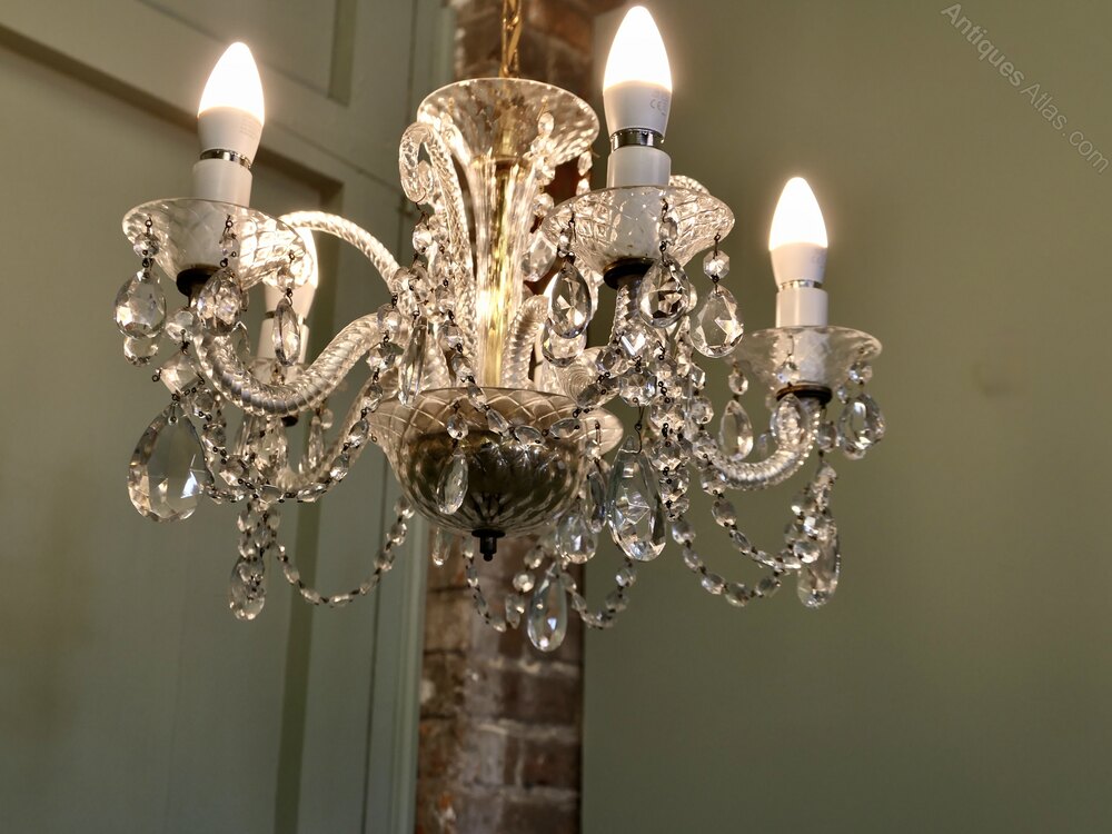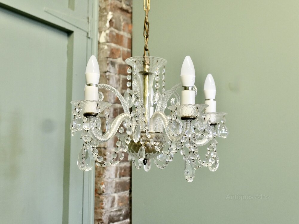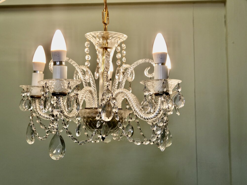 A Charming 5 Branch Venetian Style ChandelierThis is a pretty quality piece, it has twisted arms in the venetian style with a tall cut glass column at the centre and it is suspended on a long chain The light is quite dazzling when lit and will need connecting to an electrical supply