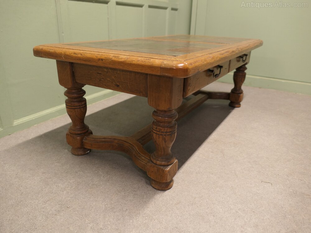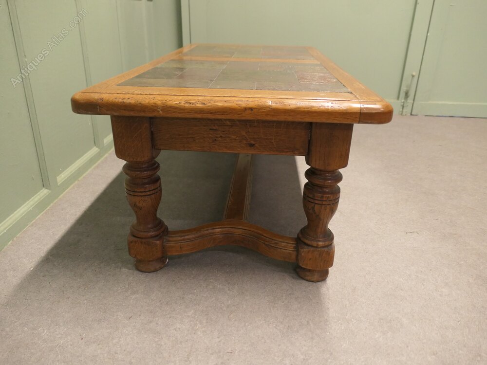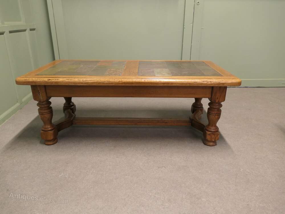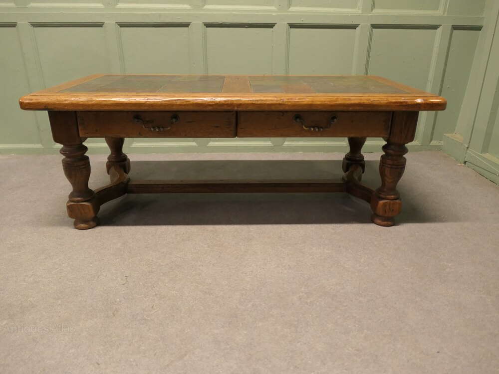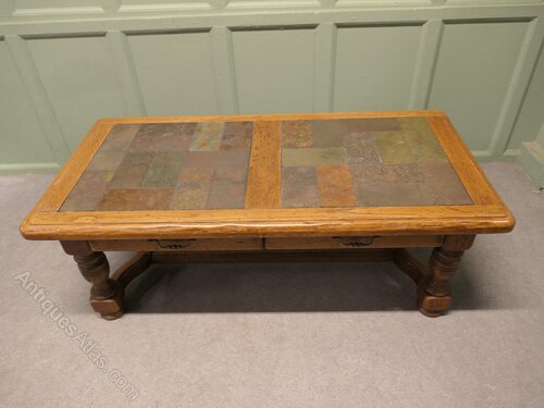 Oak Farmhouse Coffee Table with Slate TopThis is a good honest farmhouse table, it is a solid piece and is made from beautiful naturally patinated oak with curved stretchers and the table has the added advantage of having a long drawer along one side