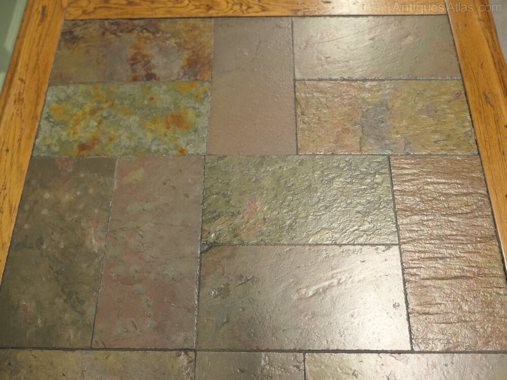 The real attraction of this table is its genuine patina and the wonderful colour and figuring of the wood and the natural slate tones