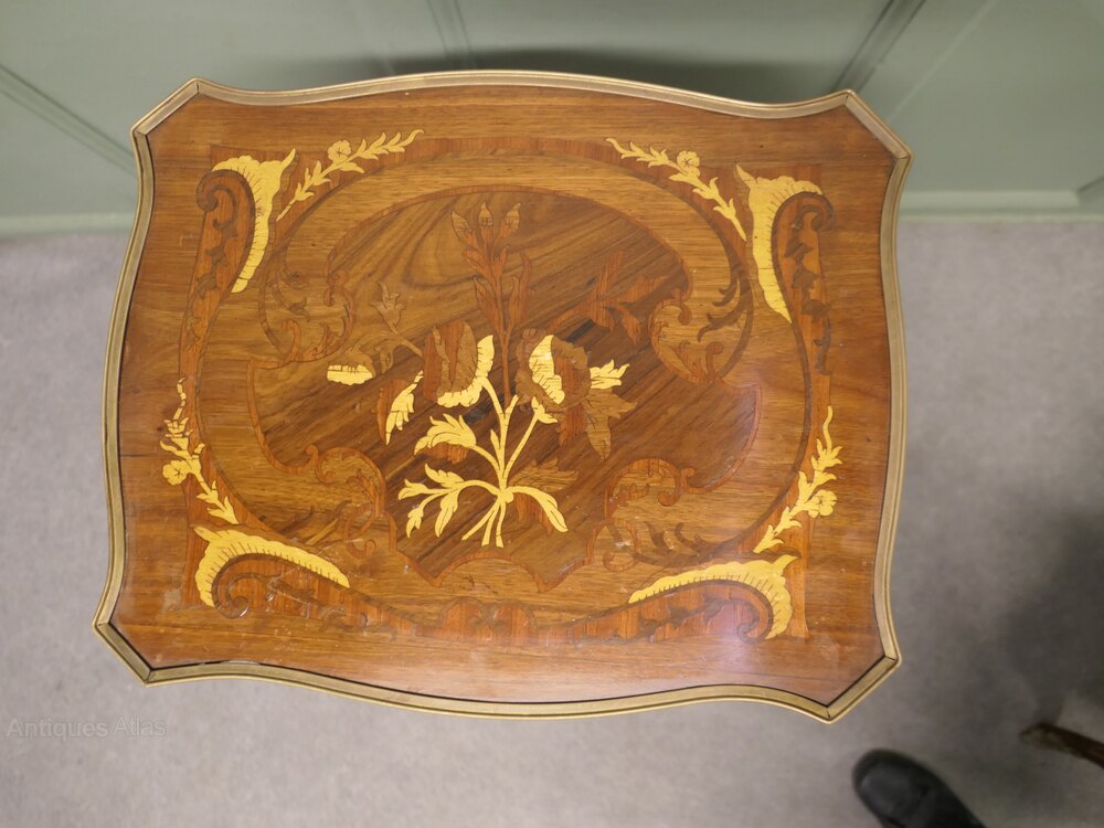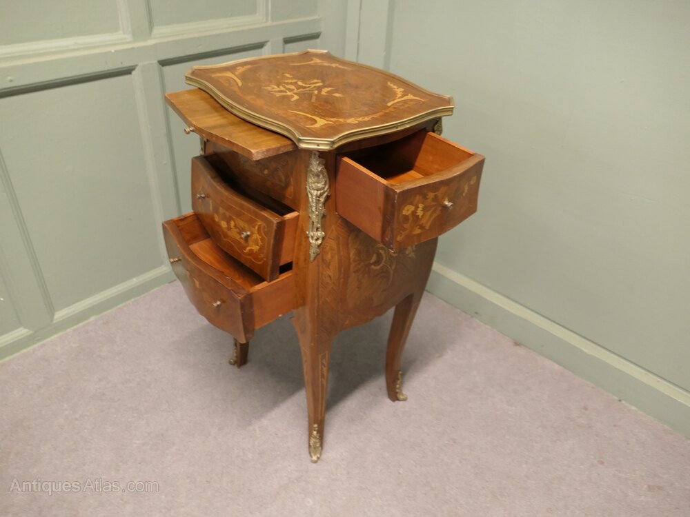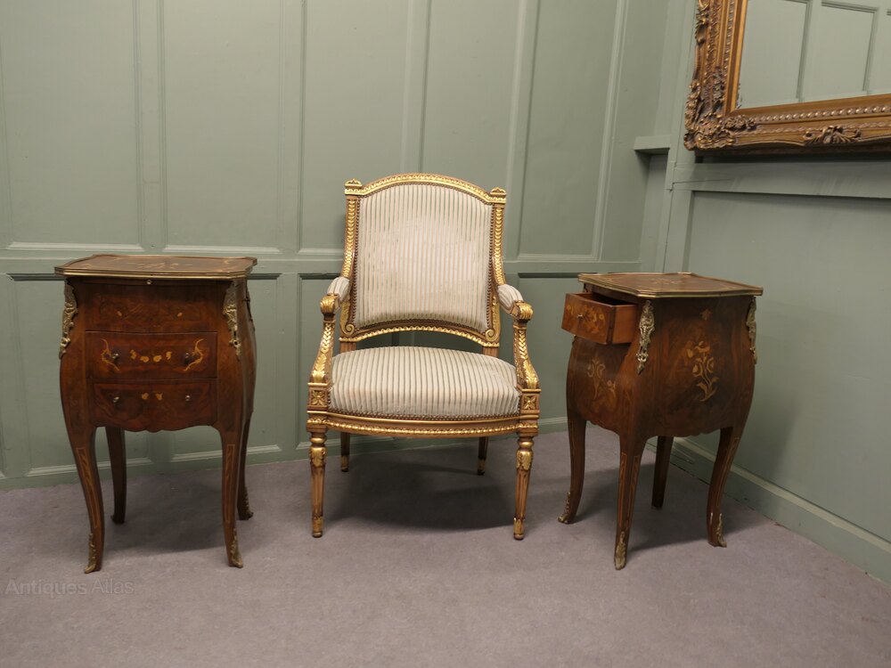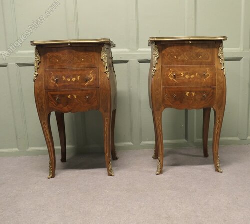 Pair of French Ormolu and Walnut Side CabinetsThis is a very beautiful pair of cabinets, they are both inlaid and the tops are edged with ormolu. The Cabinets stand on ormolu mounted legs they have 2 drawers and a slide at the front and a third drawer at the side