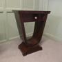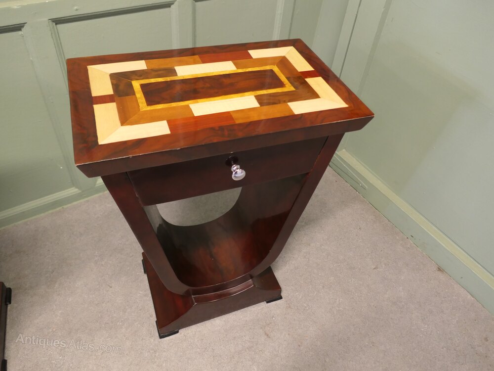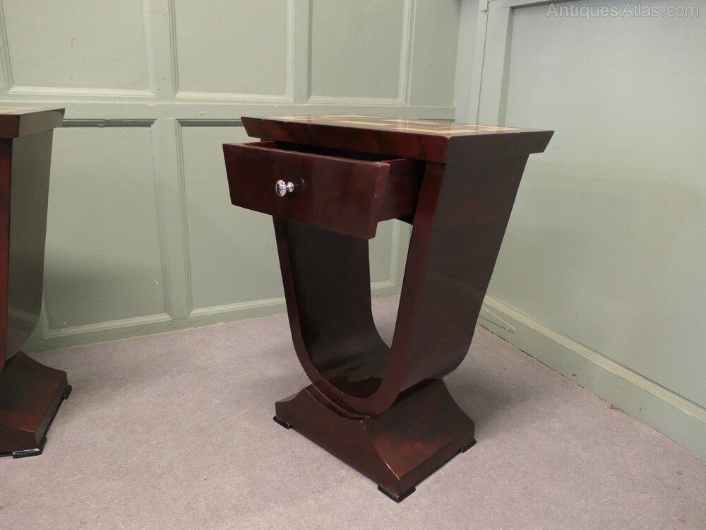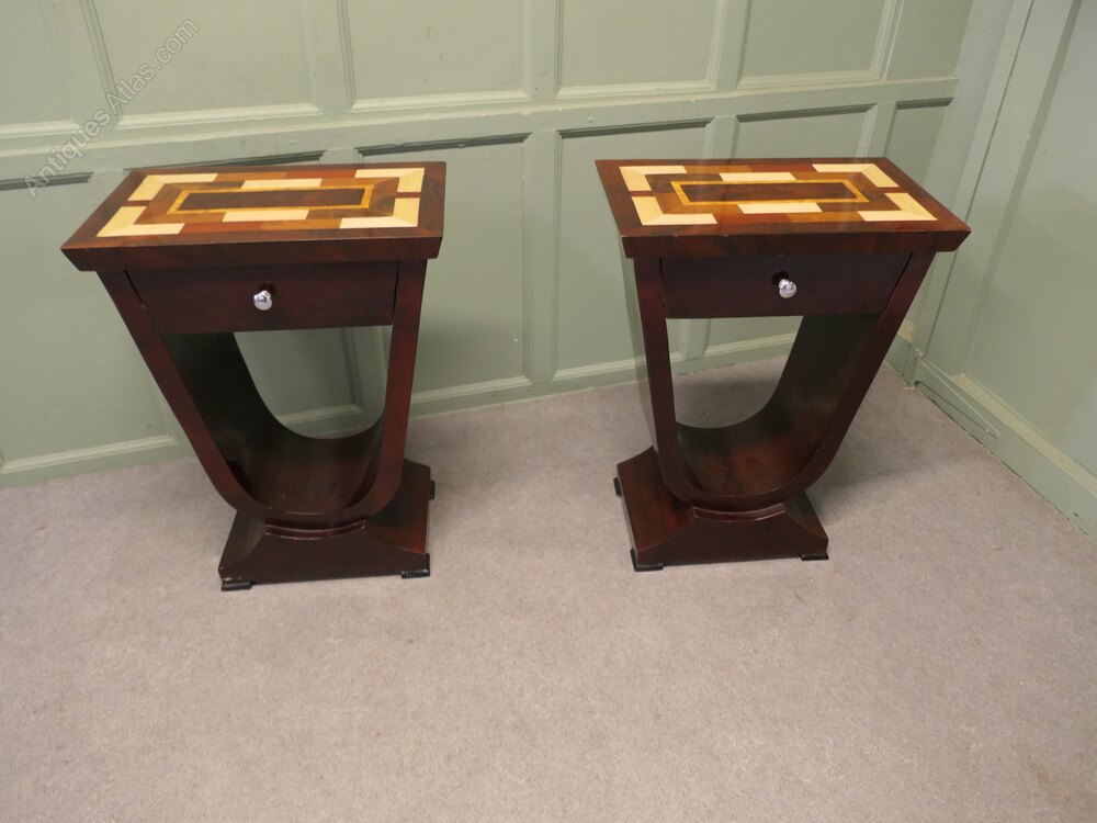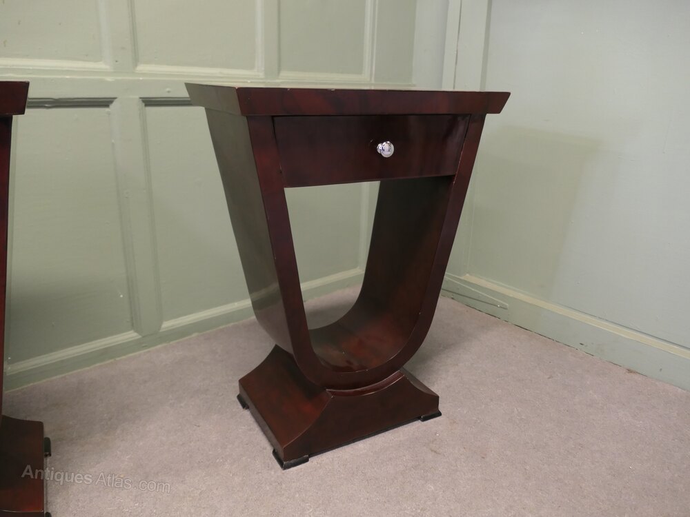 A Exceptional Pair of Art Deco Design Bedside or Lamp TablesThis pair has a very aesthetic look with a high shine finish to the wood veneered tops, they have a drawer below and an unusual shape forming the base