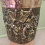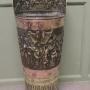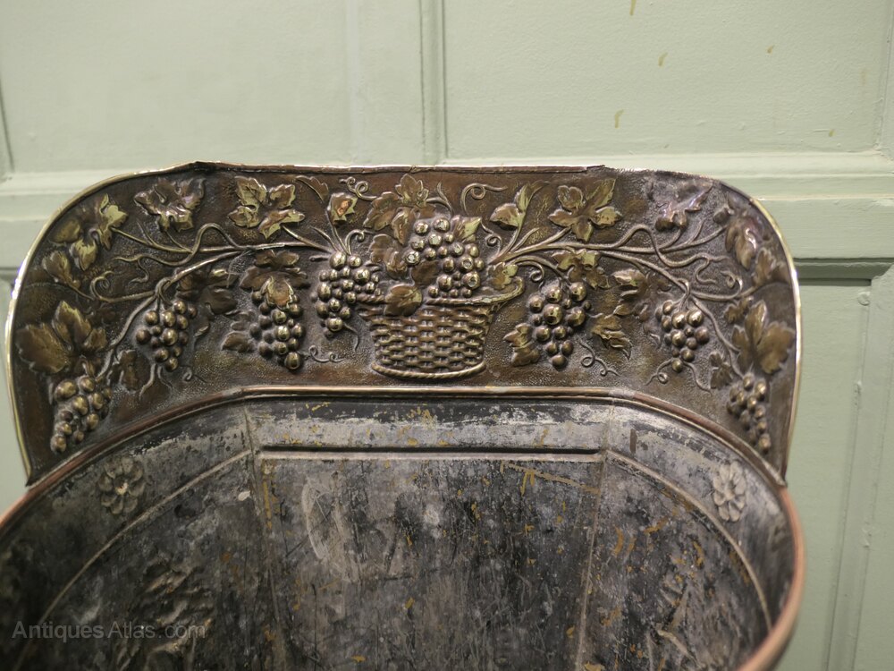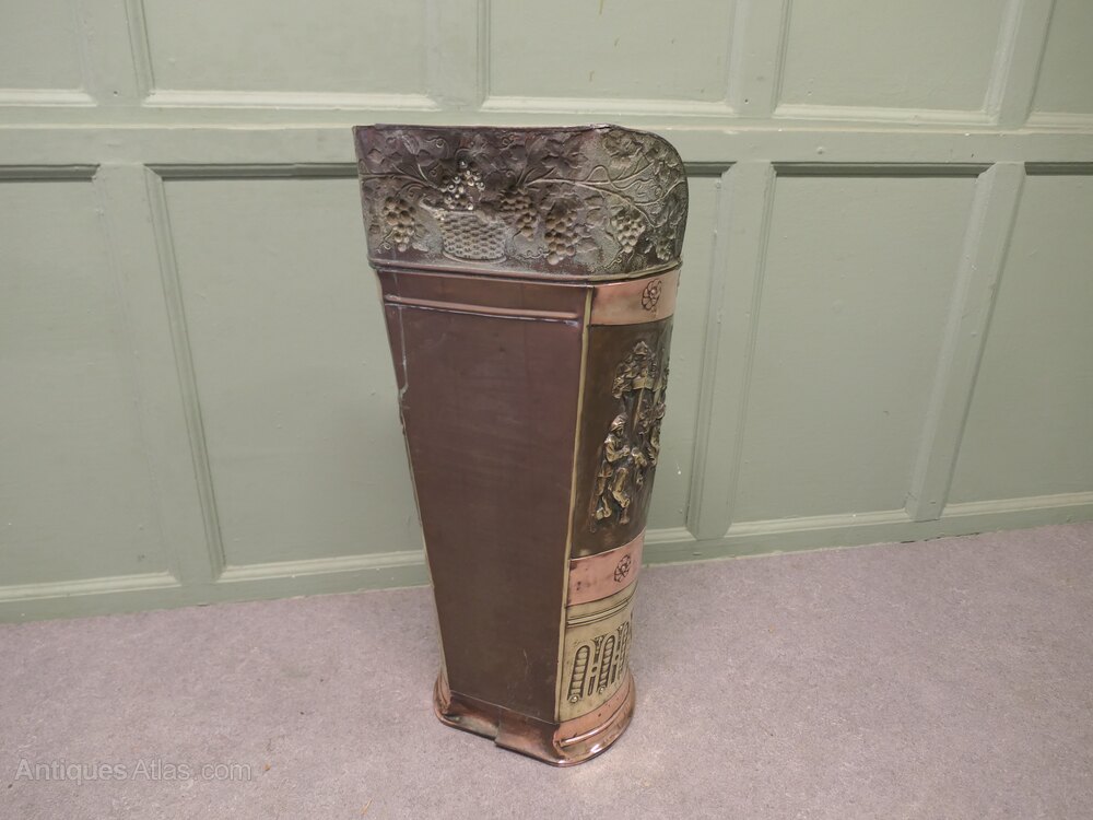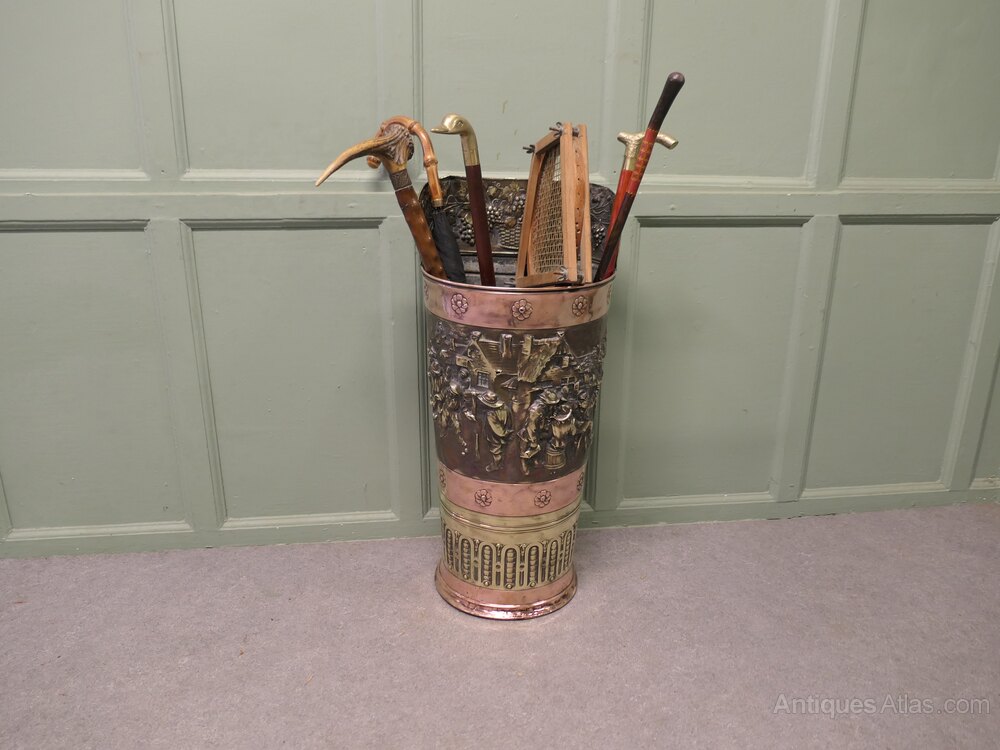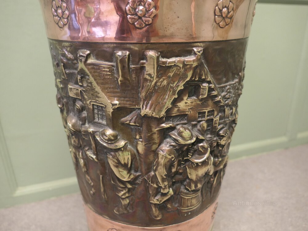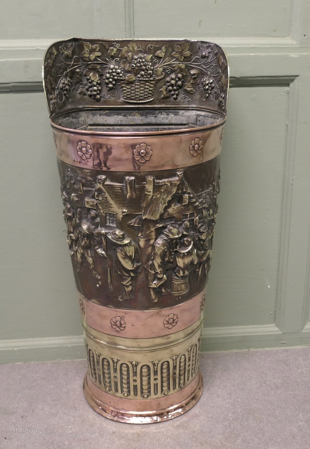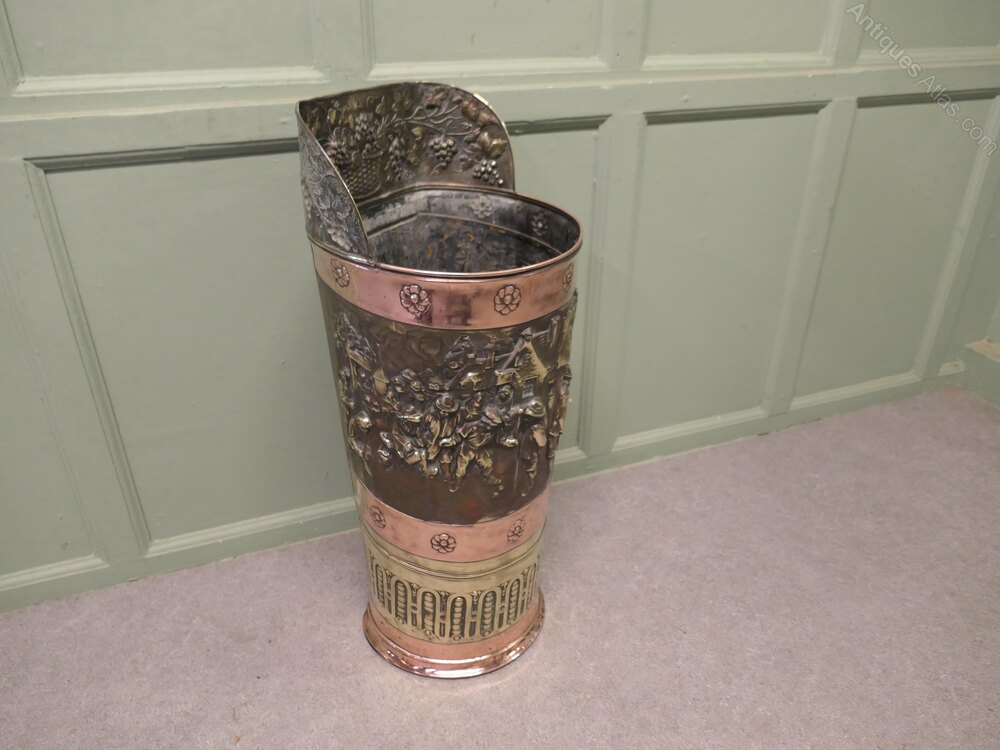 Very Large French Arts and Crafts Embossed Brass Stick StandThis is an impressive piece it is made in copper and brass it is round in shape and higher at the back, a similar shape to a French Grape hod, it is decorated with grape vines and French scenes of people relaxing drinking and playing Boule