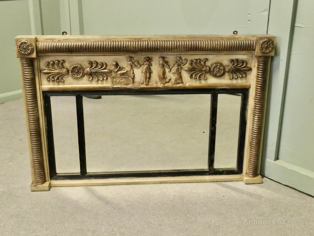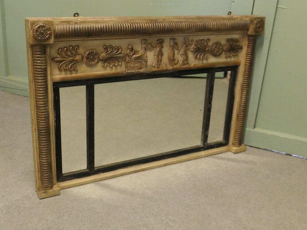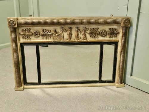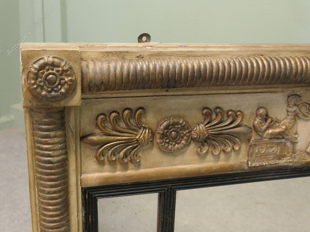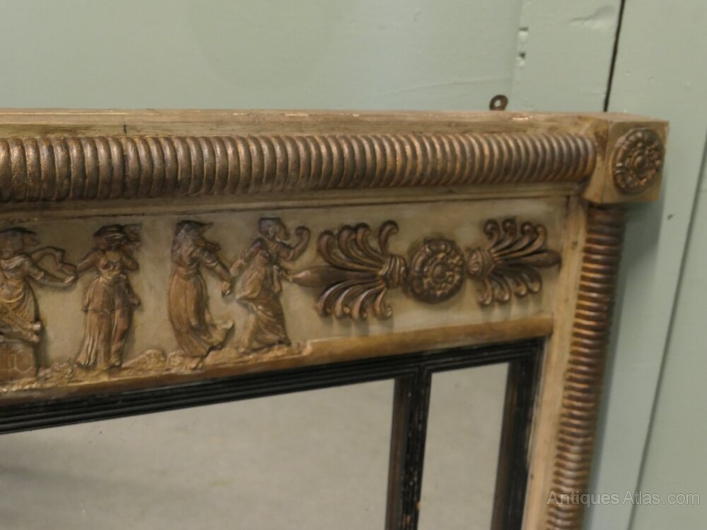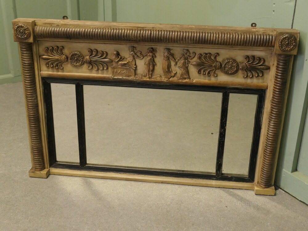 Regency Triple Plate Sculptured Mirror or Over MantleThe Regency carved Frame is a rectangular shape, it has a decorative Old Gold patina with columns at either side and along the top, there are romantic sculptures with dancers along the top