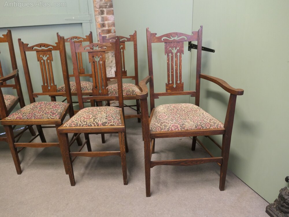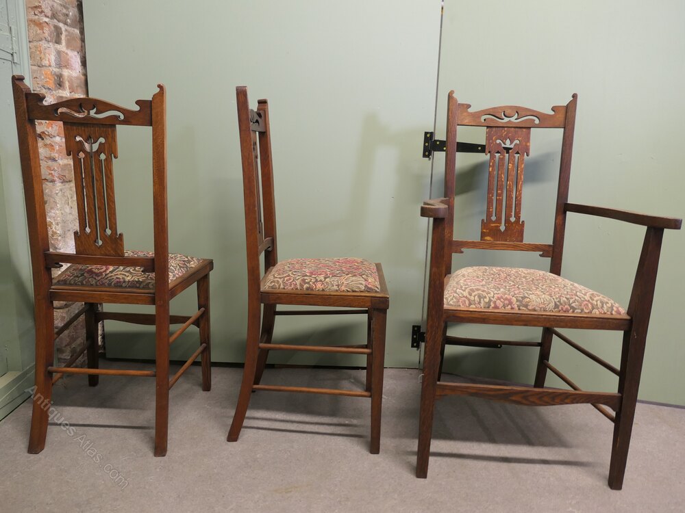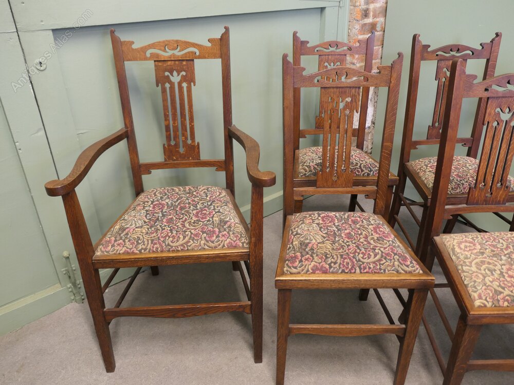 Set of 6 Arts and Crafts Golden Oak Dining ChairsThis is a very handsome set of 6 Oak Chairs, 2 Carver chairs and 4 single dining chairs the chairs have tapered legs and the backs have open carving in the Arts and Crafts style