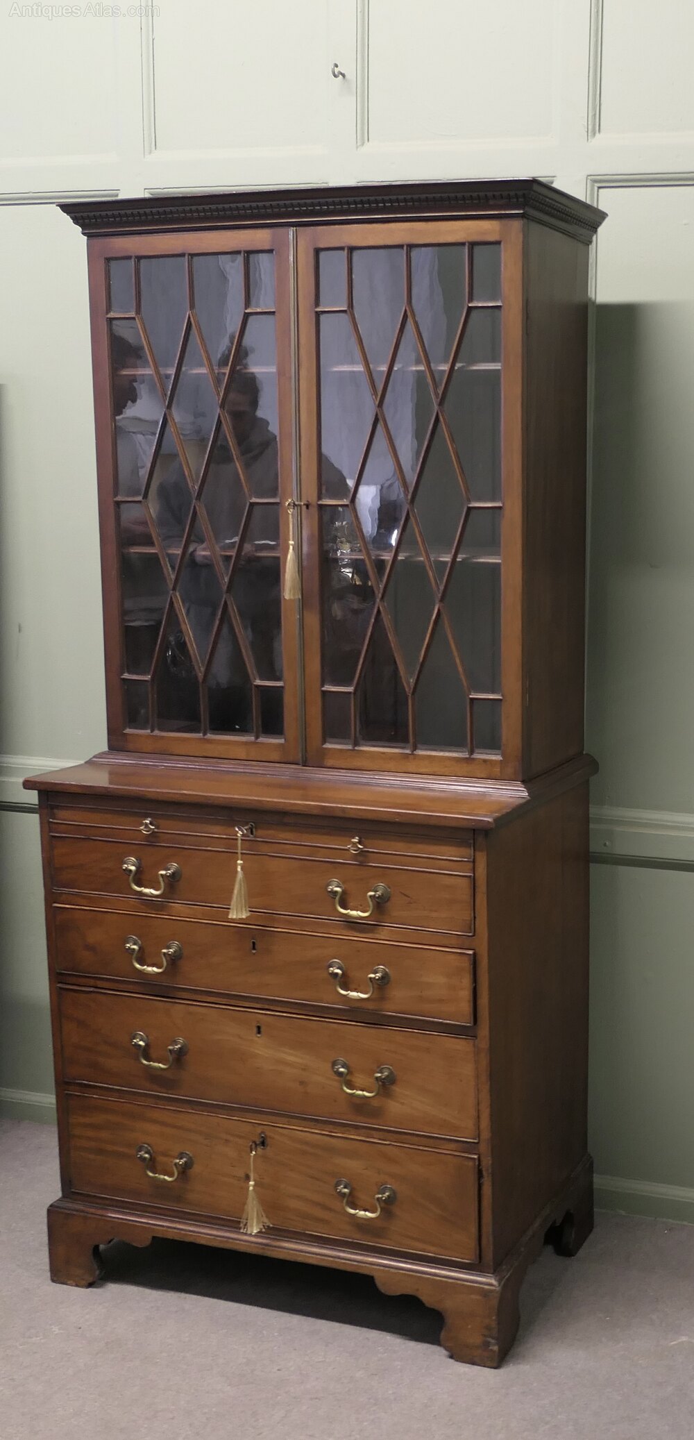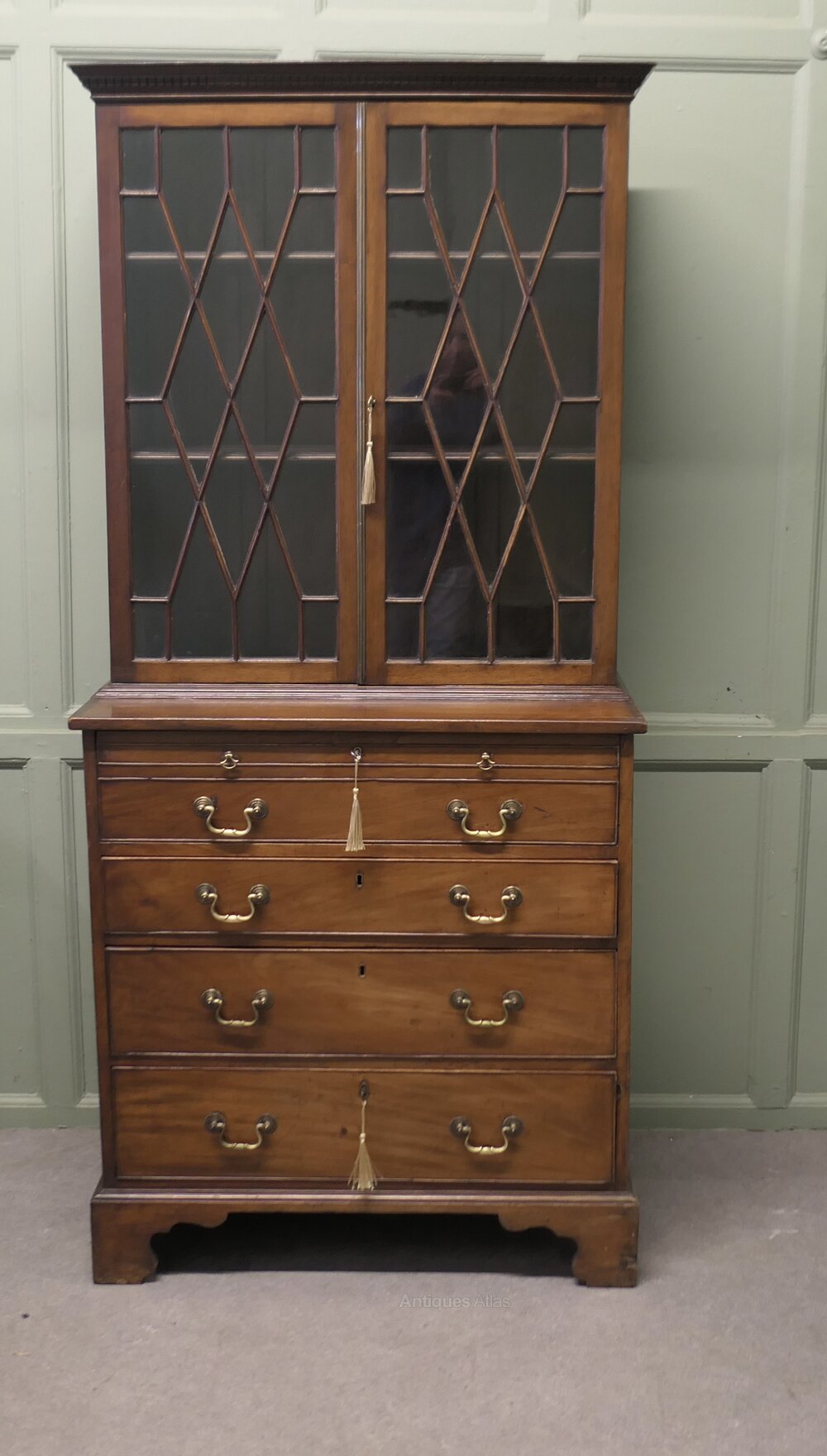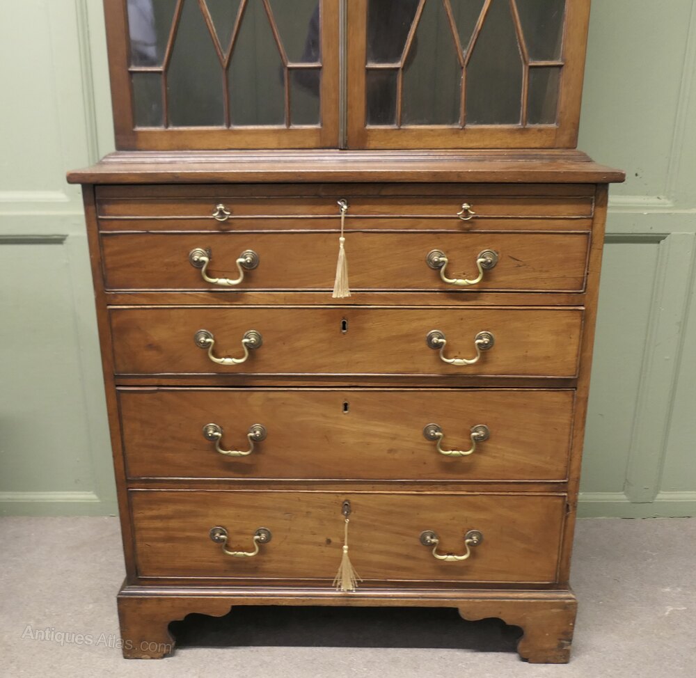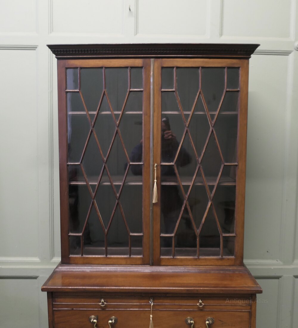 A Mahogany Bachelors Secretaire BookcaseThe top part of this piece is an Astral glazed shelved bookcase, and beneath there is a Secretaire over three long drawers