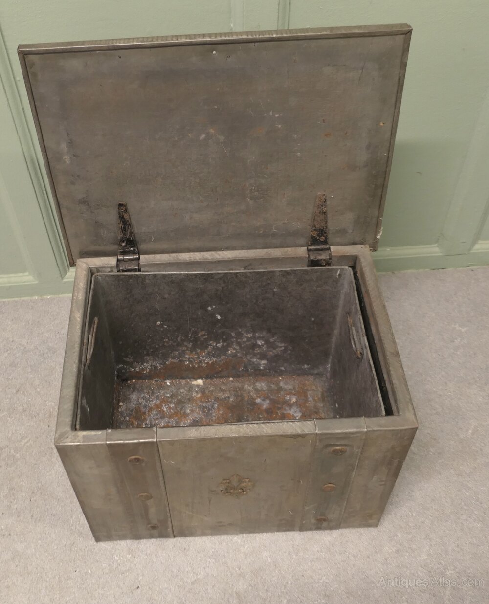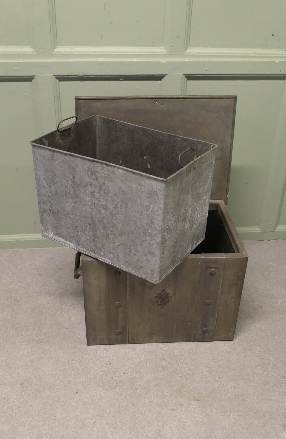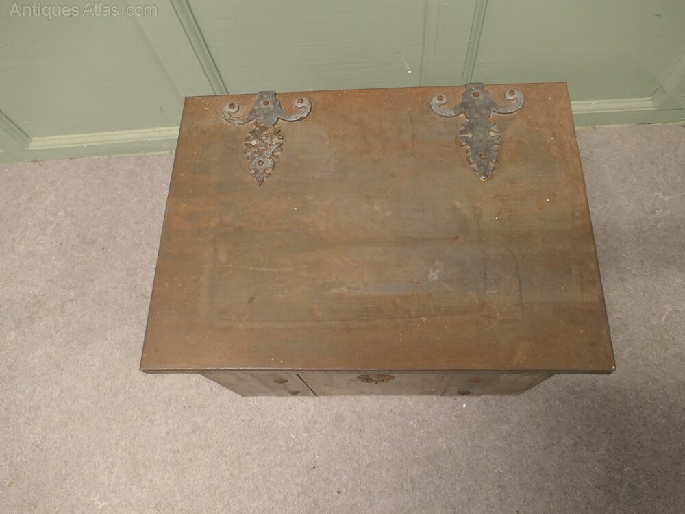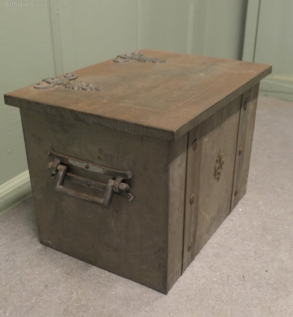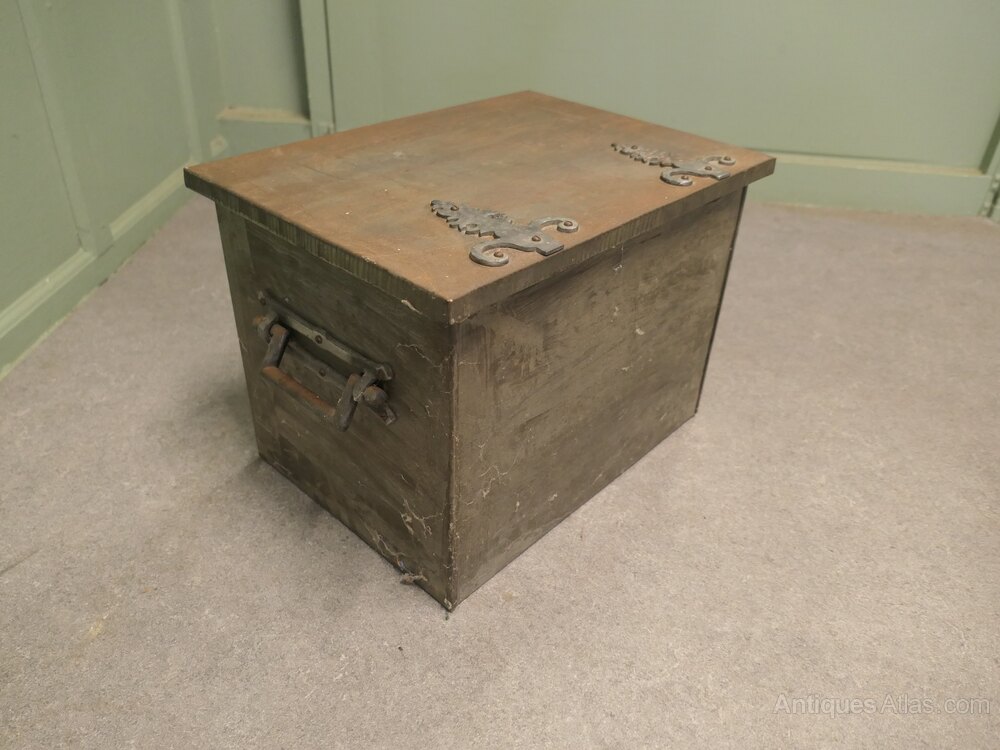 Heavy Arts and Crafts Industrial Brutalist Look Coal BoxA very practical piece, this very attractive Arts and Crafts coal box has decorative riveted hinges, strapping and a firm fitting lid, the box has very substantial carrying handles and its original metal liner.