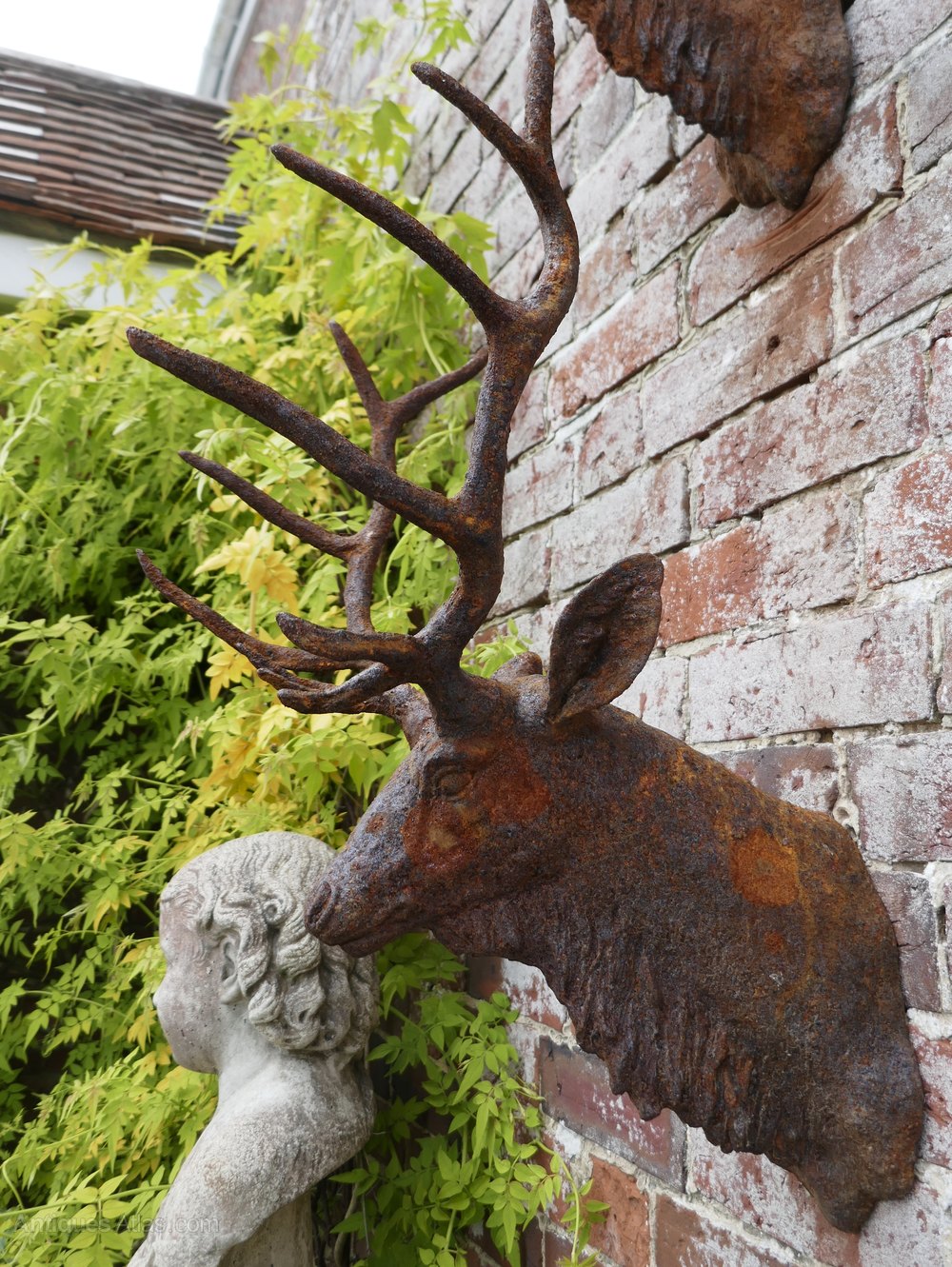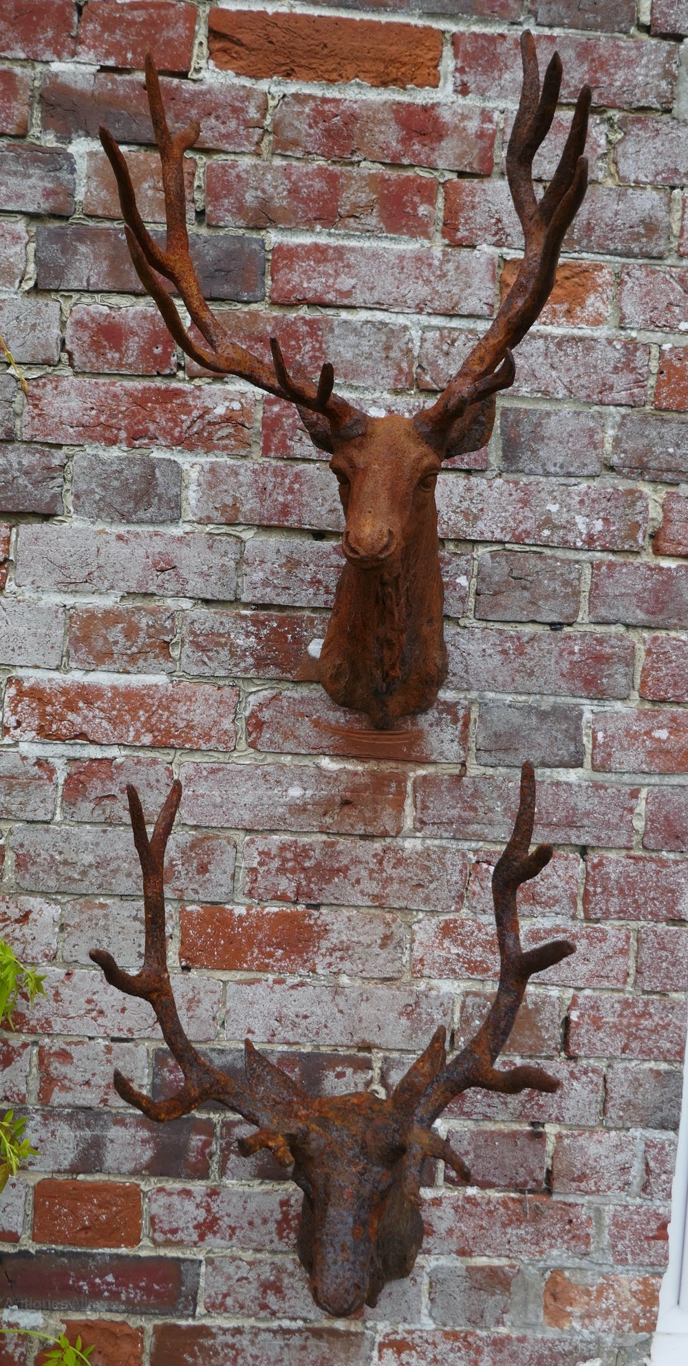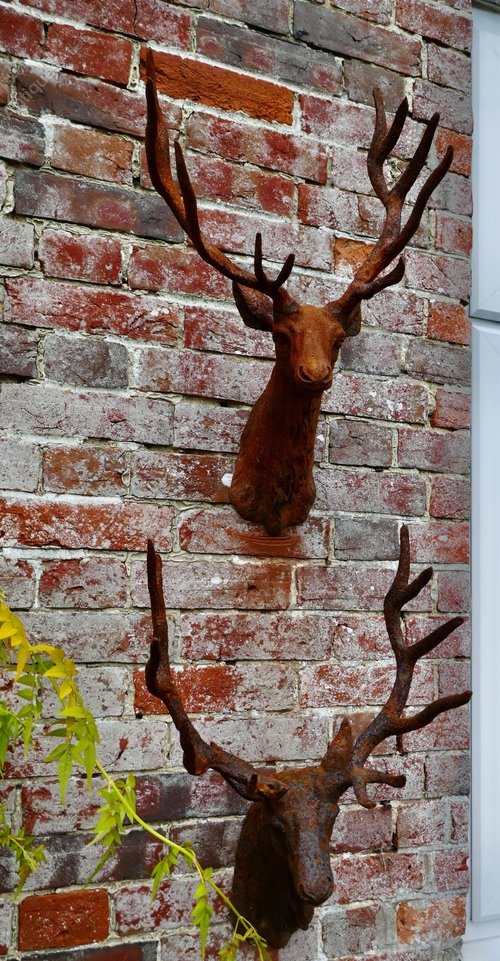 Outdoor Weathered Cast Iron Wall Hung Stags Heads