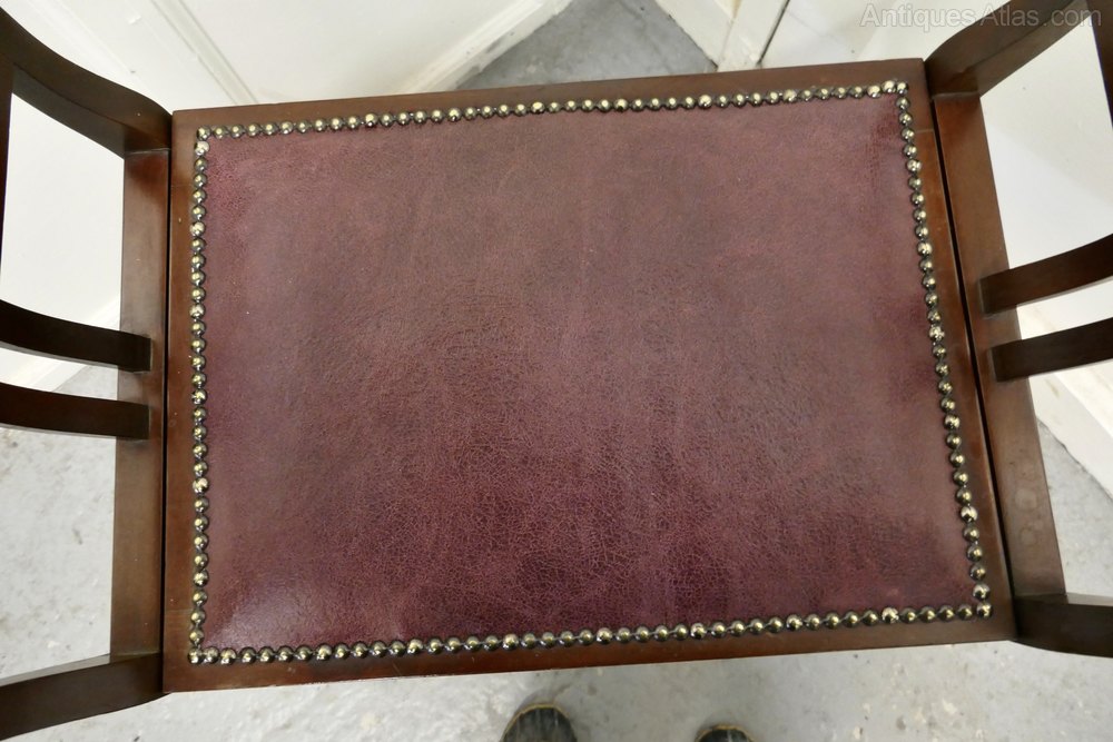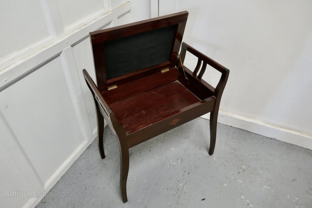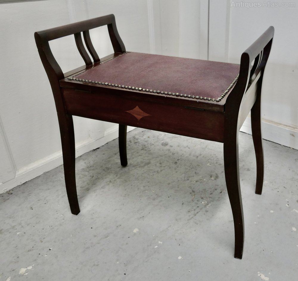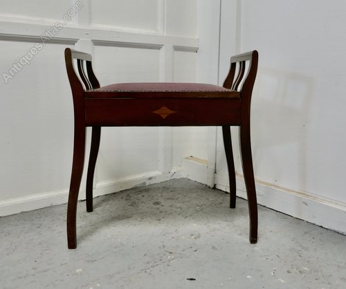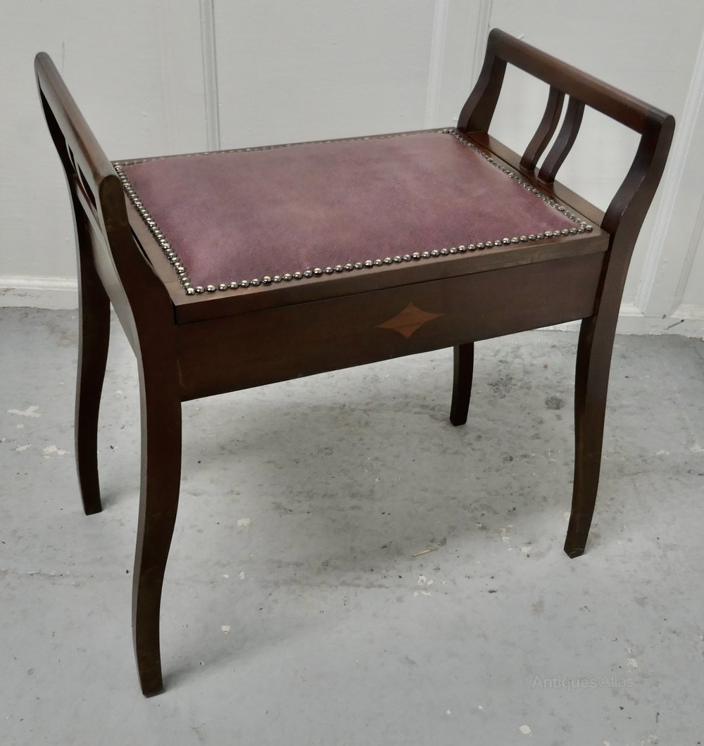 An Edwardian Inlaid Mahogany Piano StoolThis Elegant Inlaid Mahogany Piano stool is in very good condition, it has an inlaid decoration, the seat is covered with dark red leather and has a studded border