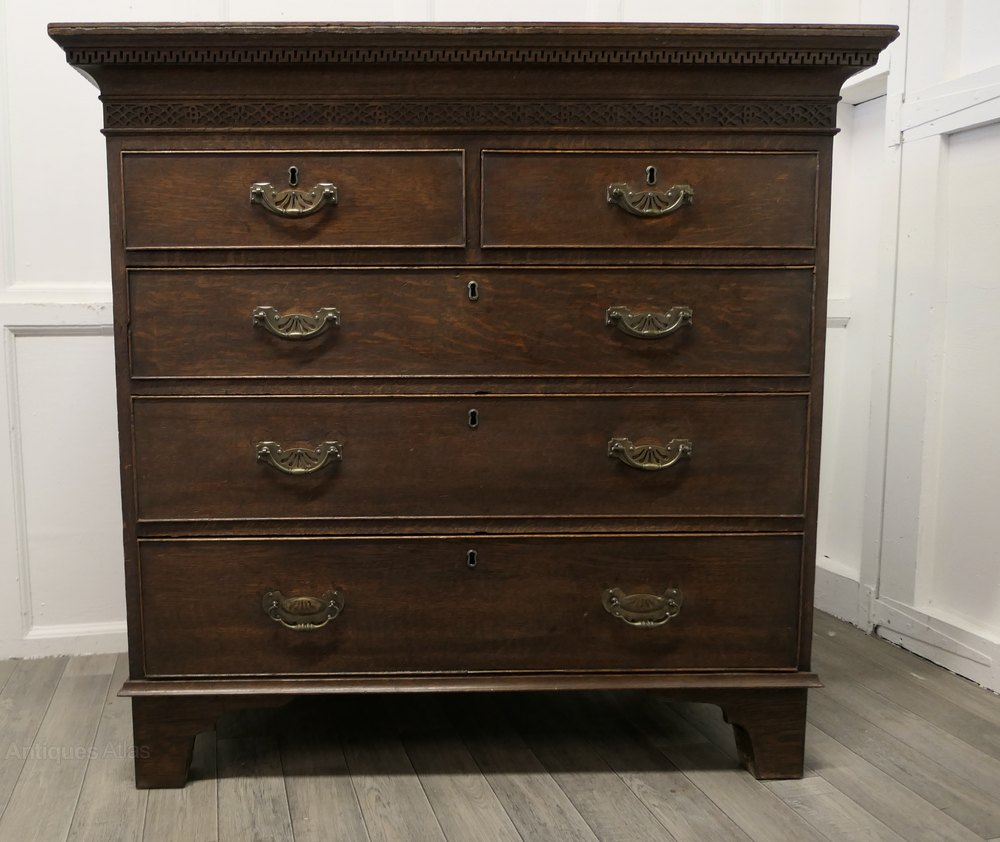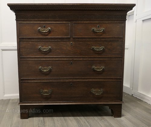 A Large Oak Chest of DrawersThis very attractive chest has two short drawers at the top and three graduated long drawers beneath, this is a heavy chest of drawers, it stands on a Bracket Footed Plinth and it has a solid oak top with an attractive carved cornice.