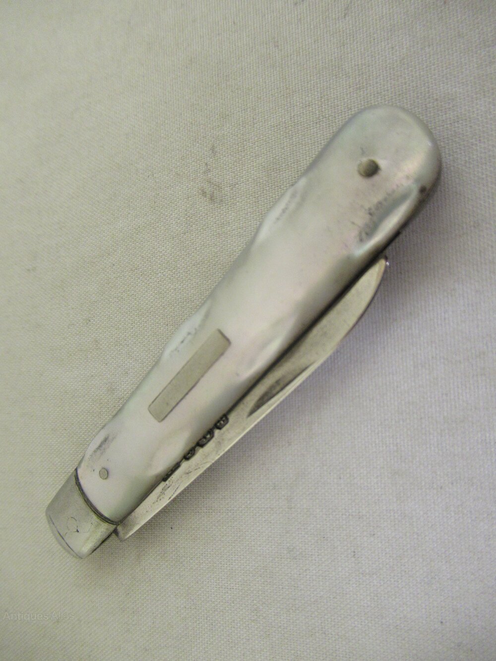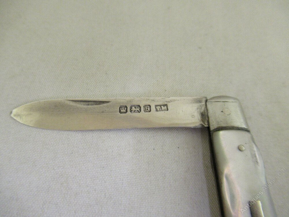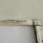 The blade opens and closes correctly - almost snaps at 180 degrees, and closes correctly. The blade is clean along the length of both sides, but the silver is very thin. A tiny dent on the back which coincides with the hallmarks.