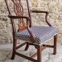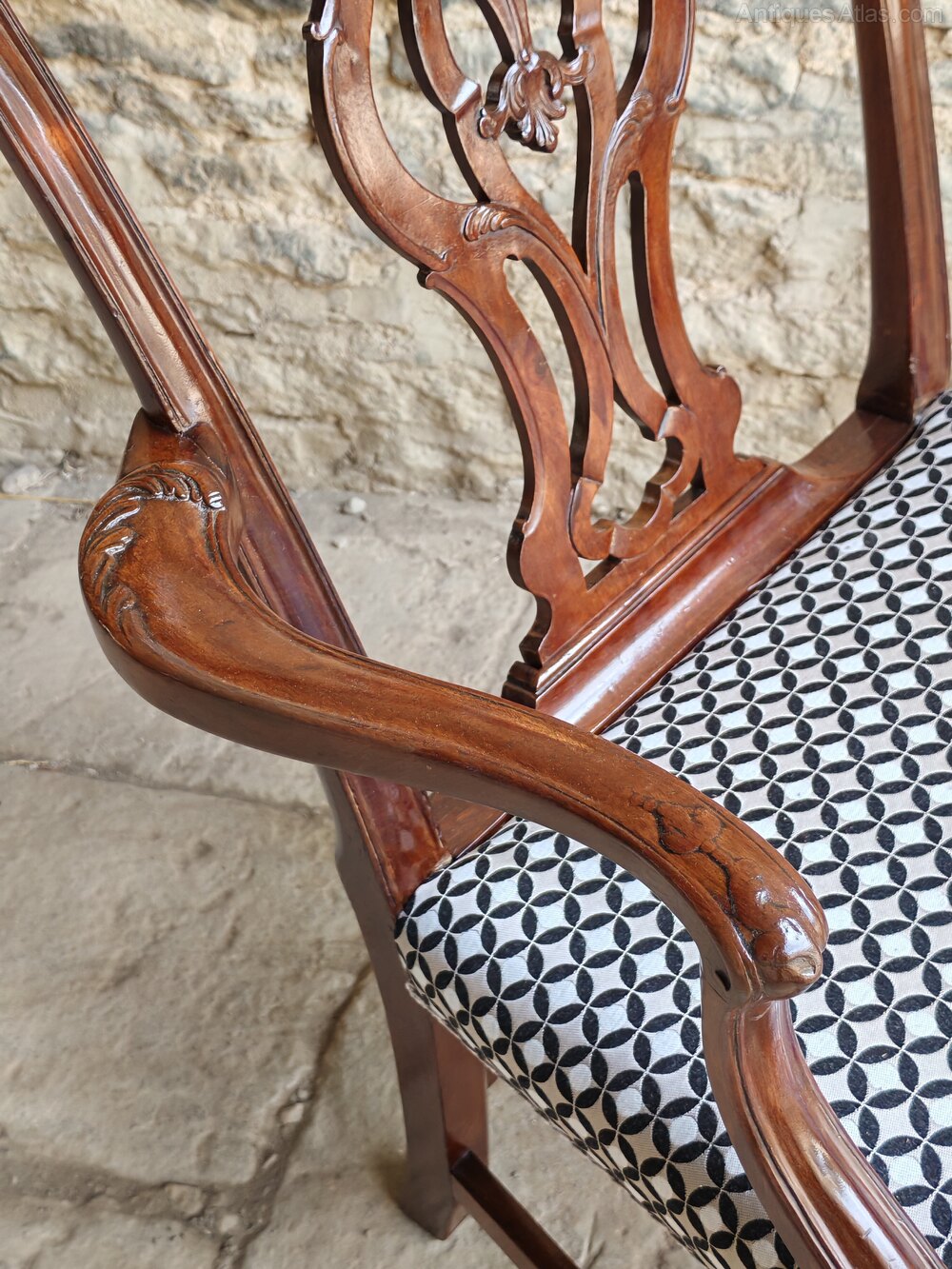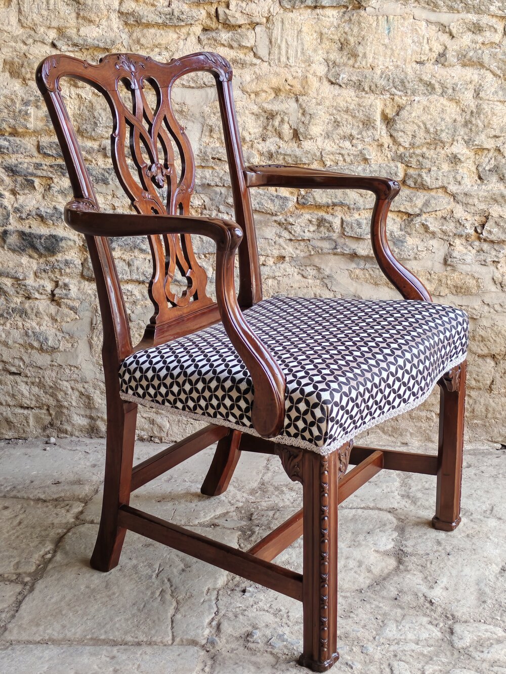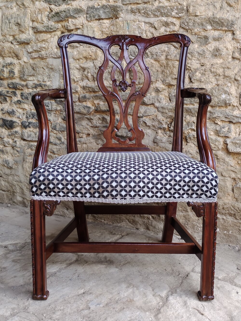 A beautiful, heavy mahogany armchair/carver circa 1810. With some quality features including carving to the back, arms and legs and unusual shaped feet to the front. The exceptionally wide serpentine fronted seat is in excellent condition. This superb chair would be ideal as an office chair but would look impressive in any room.Height - 95cm / 37.5"