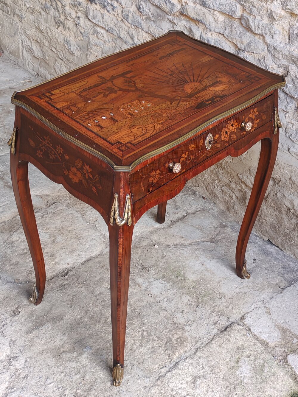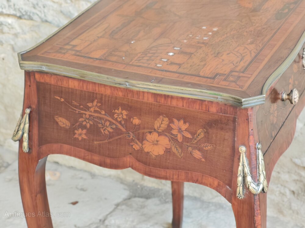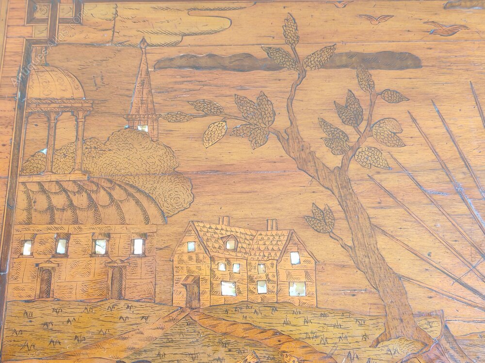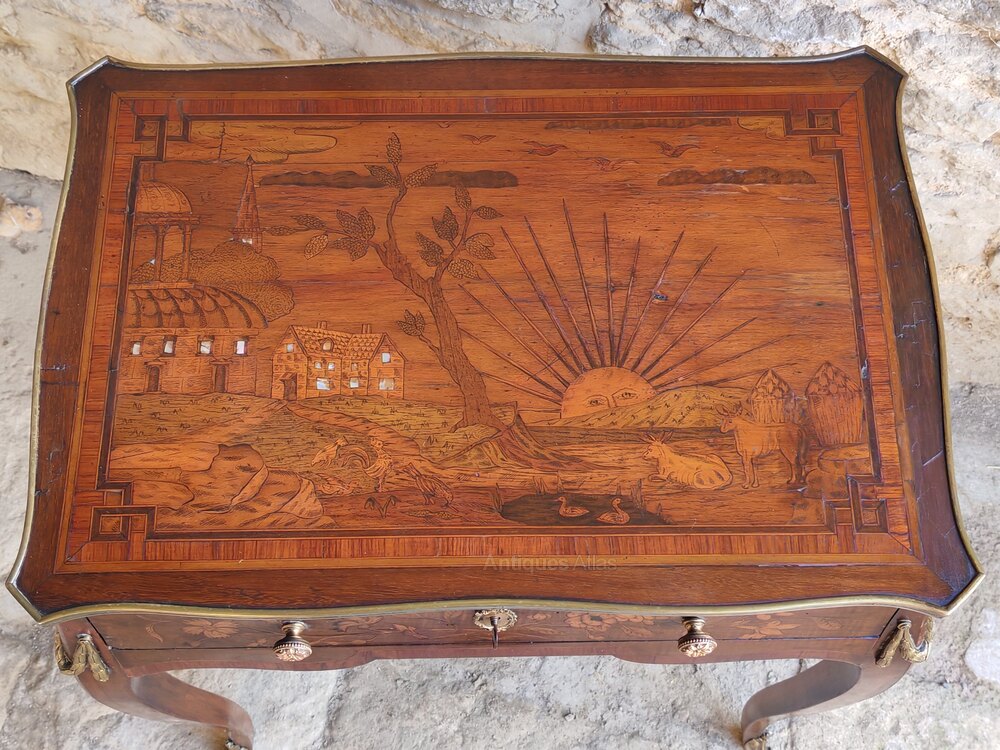 A rare Dutch walnut marquetry occasional table dating to the late 18th century. This stunning table is decorated with ormolu mounts and has floral design marquetry on all sides - including the back.But what really sets this table apart is the marquetry top with its rural landscape. The detail is superb and you notice something different every time you look at it from the birds flying across the sky to the birds on the pond. The buildings have mother of pearl windows which give them an illuminated effect.