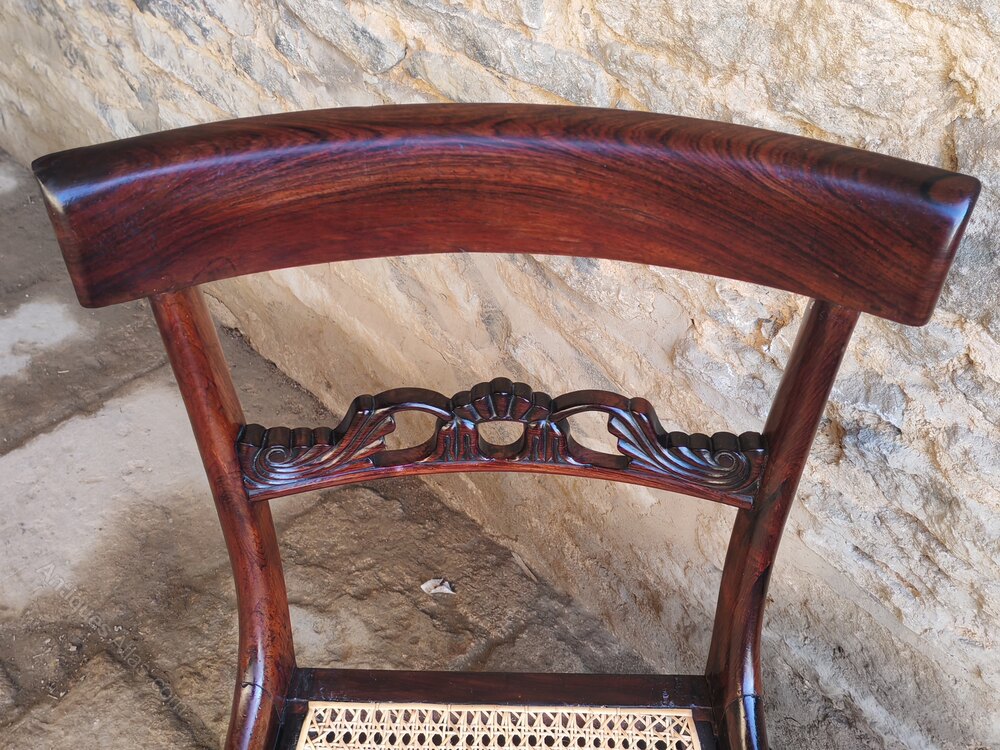 A superb pair of Regency rosewood dining chairs circa 1830. These quality chairs have a nicely carved centre rail, turned and reeded front legs and outswept back legs to give them a look of elegance. The caned seats are in excellent condition as are the cushioned drop in seats. A good solid pair of chairs that are ready to go straight in to any room of the house.Height - 33.5"/ 85cm