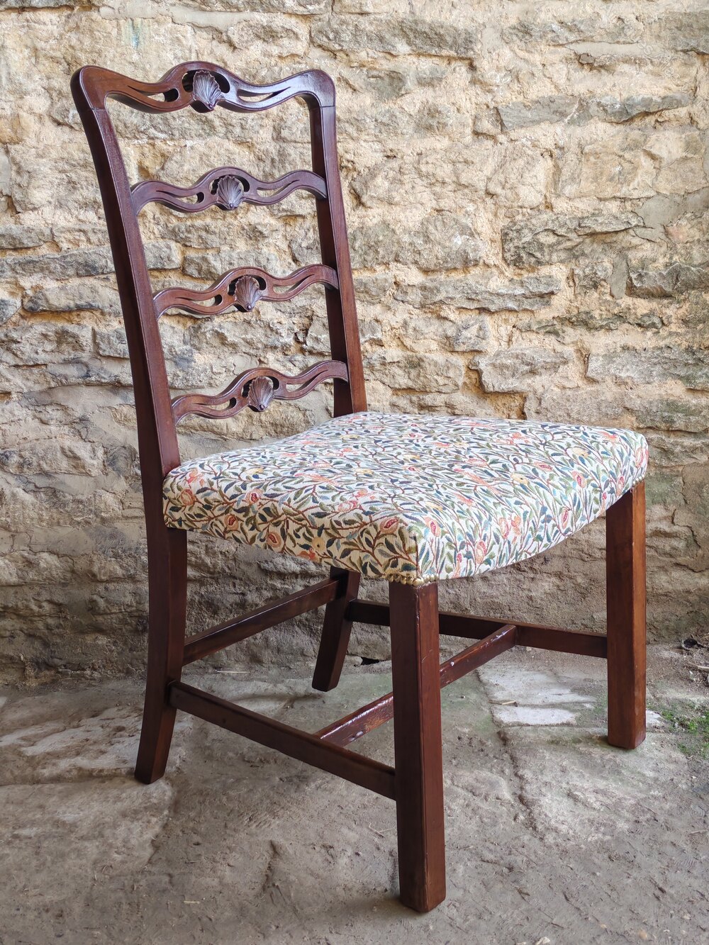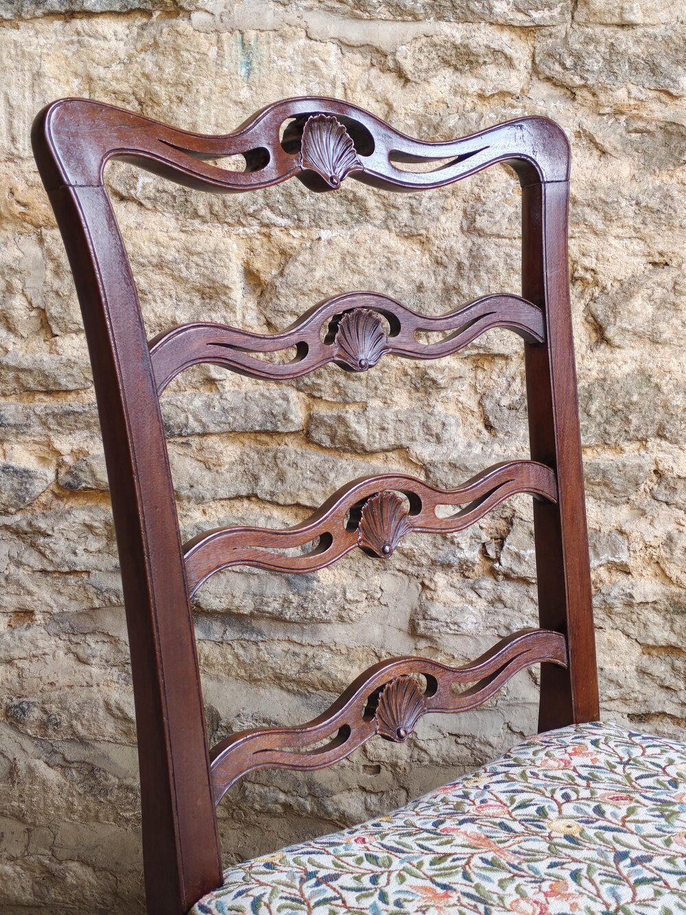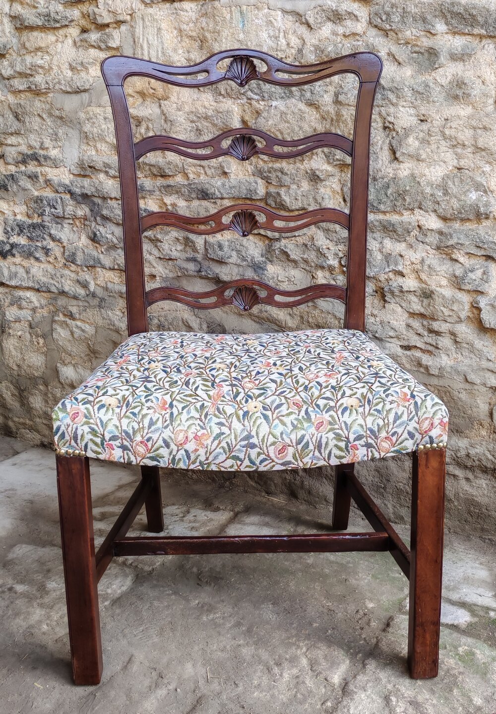 A beautiful mahogany ladderback side chair in the Georgian style circa 1870. With unusual carved shells to the back.A good solid chair with the legs joined by an H stretcher. A nice wide seat which is in excellent condition having been re-covered.