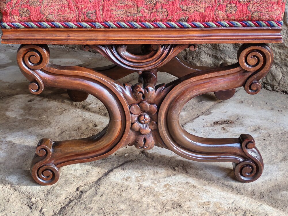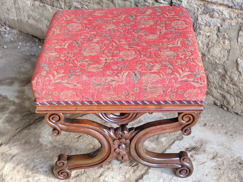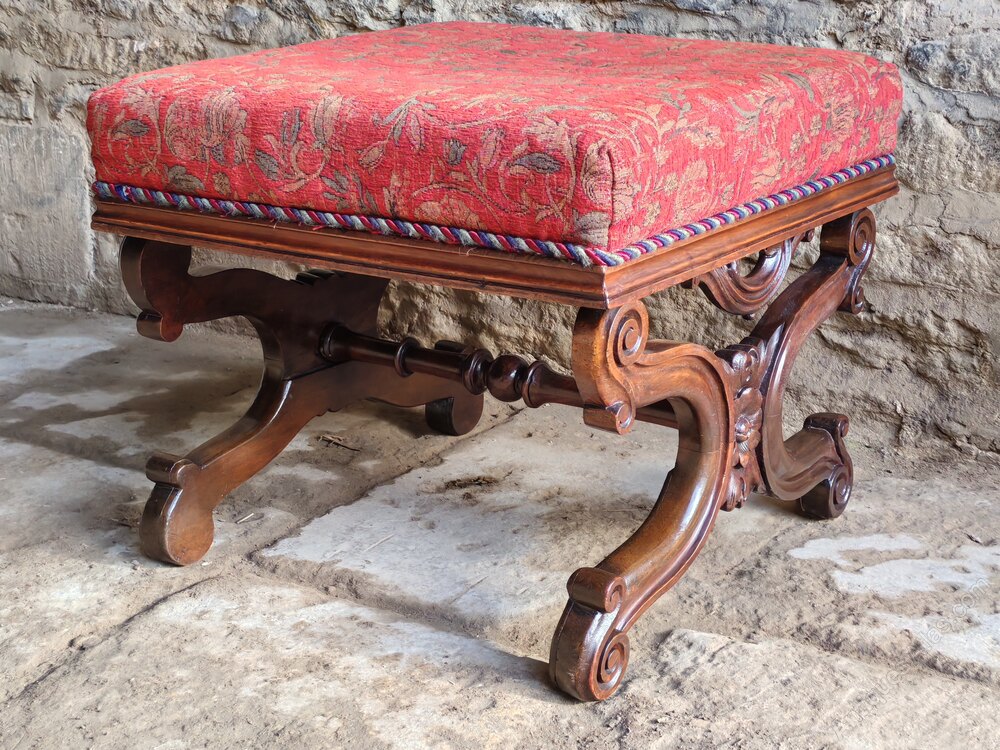 A beautiful carved, mahogany x-frame stool circa 1850. The carved frame is joined by a turned stretcher.The seat is in good condition.