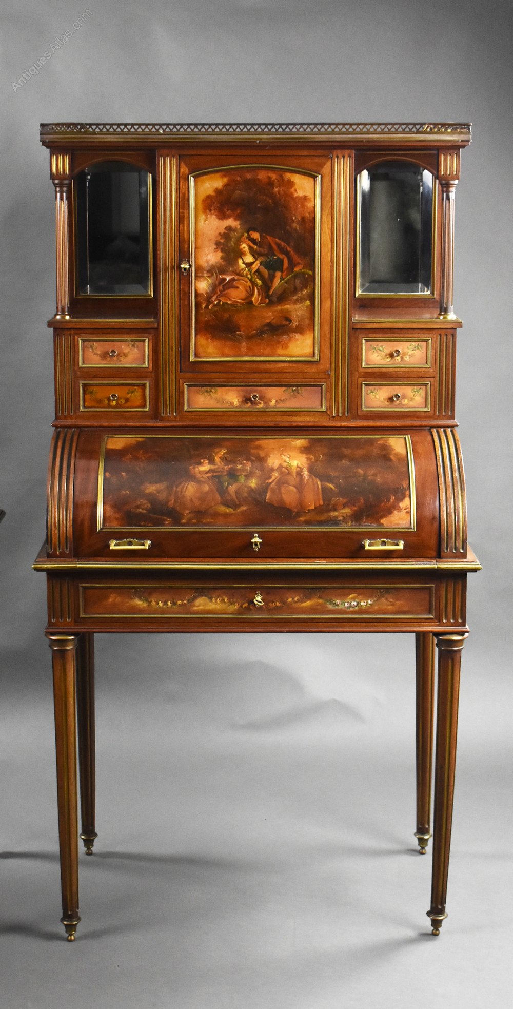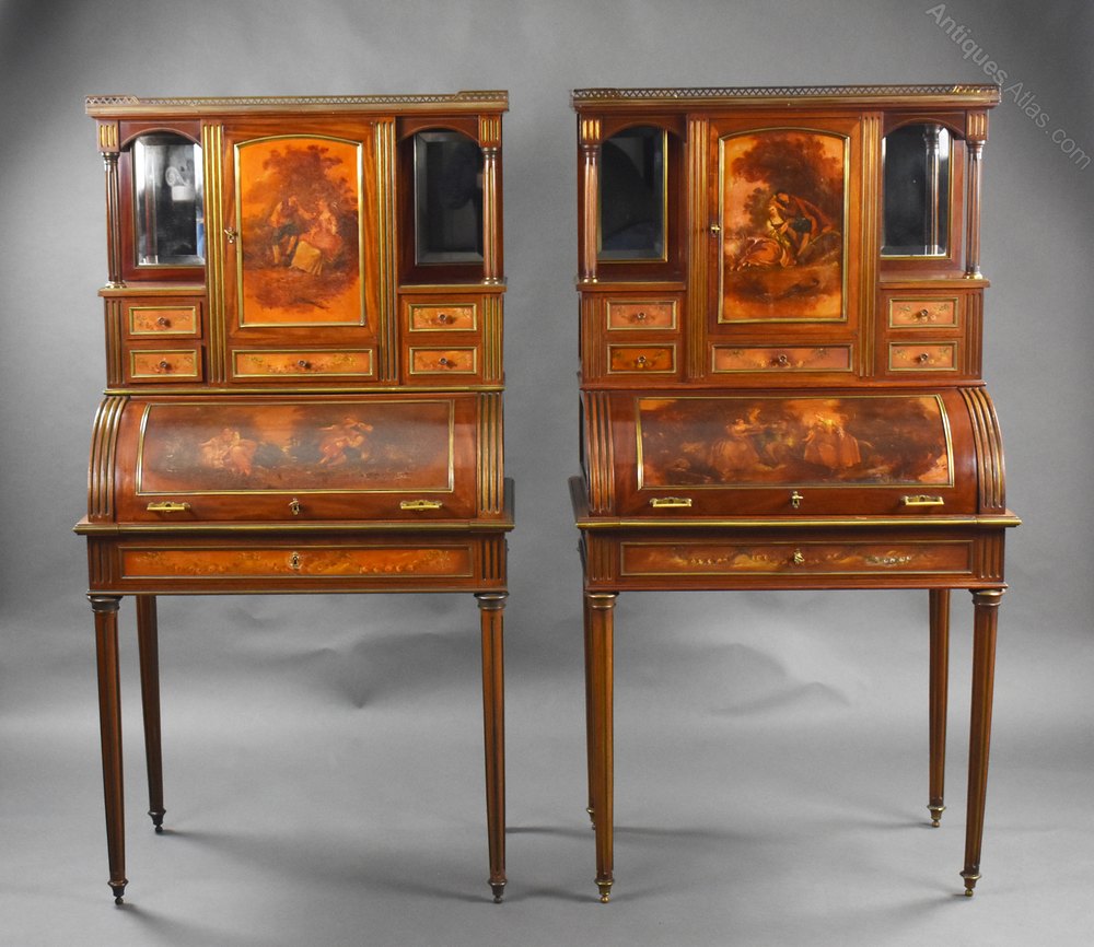 For sale is a good quality rare pair of 19th century French Vernis Martin cylinder top desks, each having marble tops with brass gallery, above a hand painted cupboard, flanked by mirrors and columns, over an arrangement of five drawers with a cylinder front below, opening to reveal a fully fitted interior with a leather writing surface decorated with gold tooling. Each desk stands on tapered fluted legs and remains ion very good condition showing minor signs of wear commensurate with age and use.Width: 81cm Depth: 51cm Height: 153cm