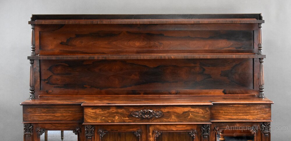 A fine quality William IV chiffonier, beautifully constructed in richly grained rosewood. The piece features a raised back with two fixed display shelves supported by turned uprights, all framed by a shaped gallery. The lower section offers a central cupboard flanked by mirrored panels, with carved foliate decoration to the stiles and door fronts. A shaped frieze drawer sits above the cupboard, adding both elegance and practical storage. The piece presents very well, with minor signs of wear commensurate with age and use. A refined and decorative piece ideal for dining or drawing room settings.