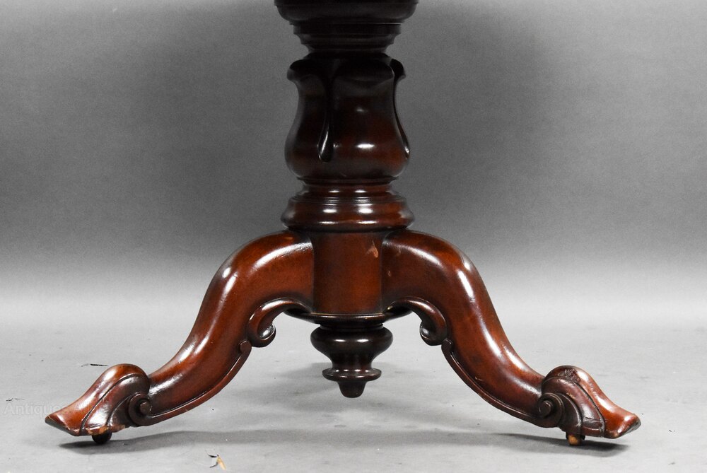 An impressive Victorian period mahogany breakfast table of circular form, crafted from solid mahogany. The well-figured one-piece top showcases the depth and warmth of the timber, resting on a bold turned pedestal and a finely carved triform base. Cabriole legs with scroll feet complete the elegant profile, making this a refined and functional centrepiece for any traditional dining or breakfast room.