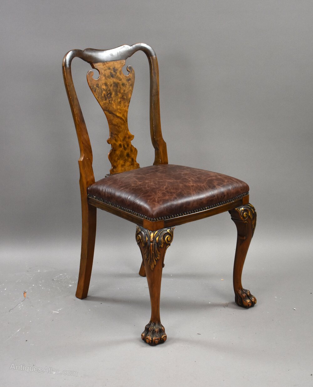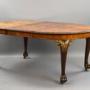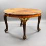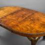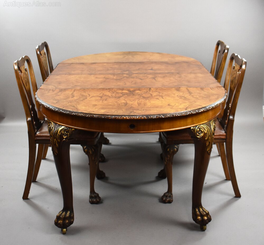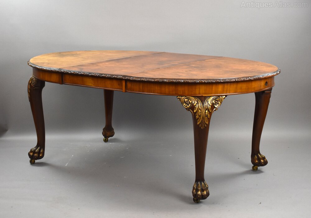 Queen Anne Style Burr Walnut Wind out Dining Table with two leaves and carved claw feet.This elegant Queen Anne style dining table showcases timeless craftsmanship and a beautifully refined silhouette. The burr walnut top features striking swirling grain patterns and is bordered by an intricately carved molded edge, adding warmth and luxury to any dining space.